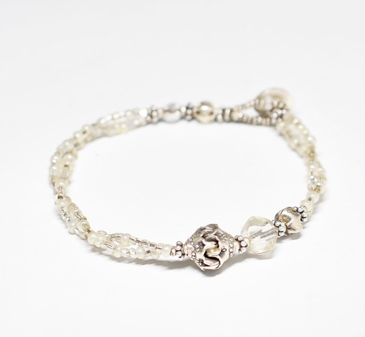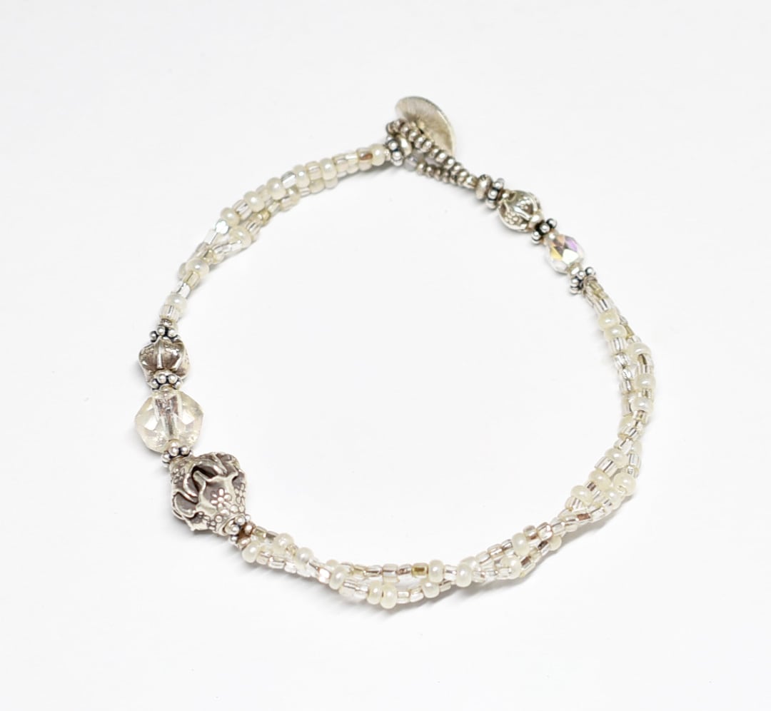 様々なガラスビーズの表情が楽しめる、優しい雰囲気のブレスです。