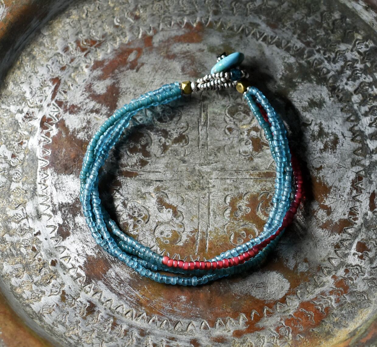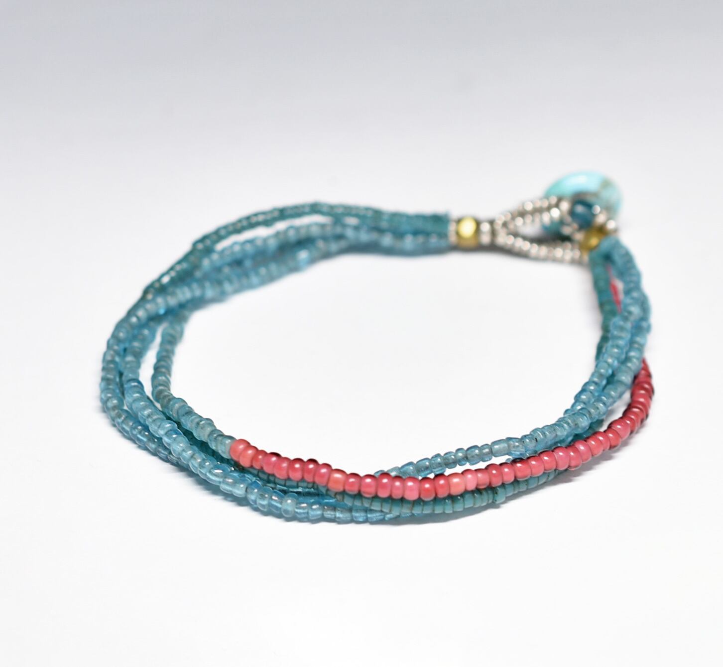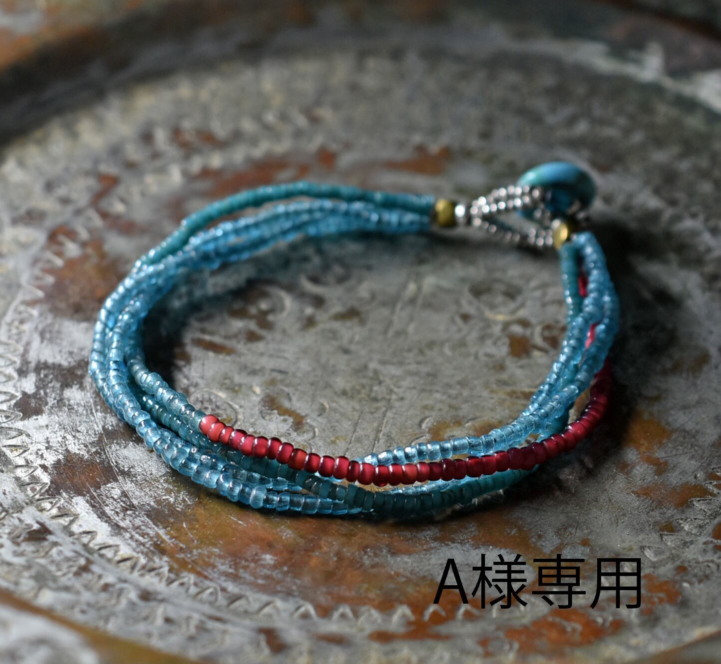 「A様専用」アンティーク水浅葱色&水色シードビーズ、金赤ホワイトハーツの4連ブレス(ターコイズ留め金)
