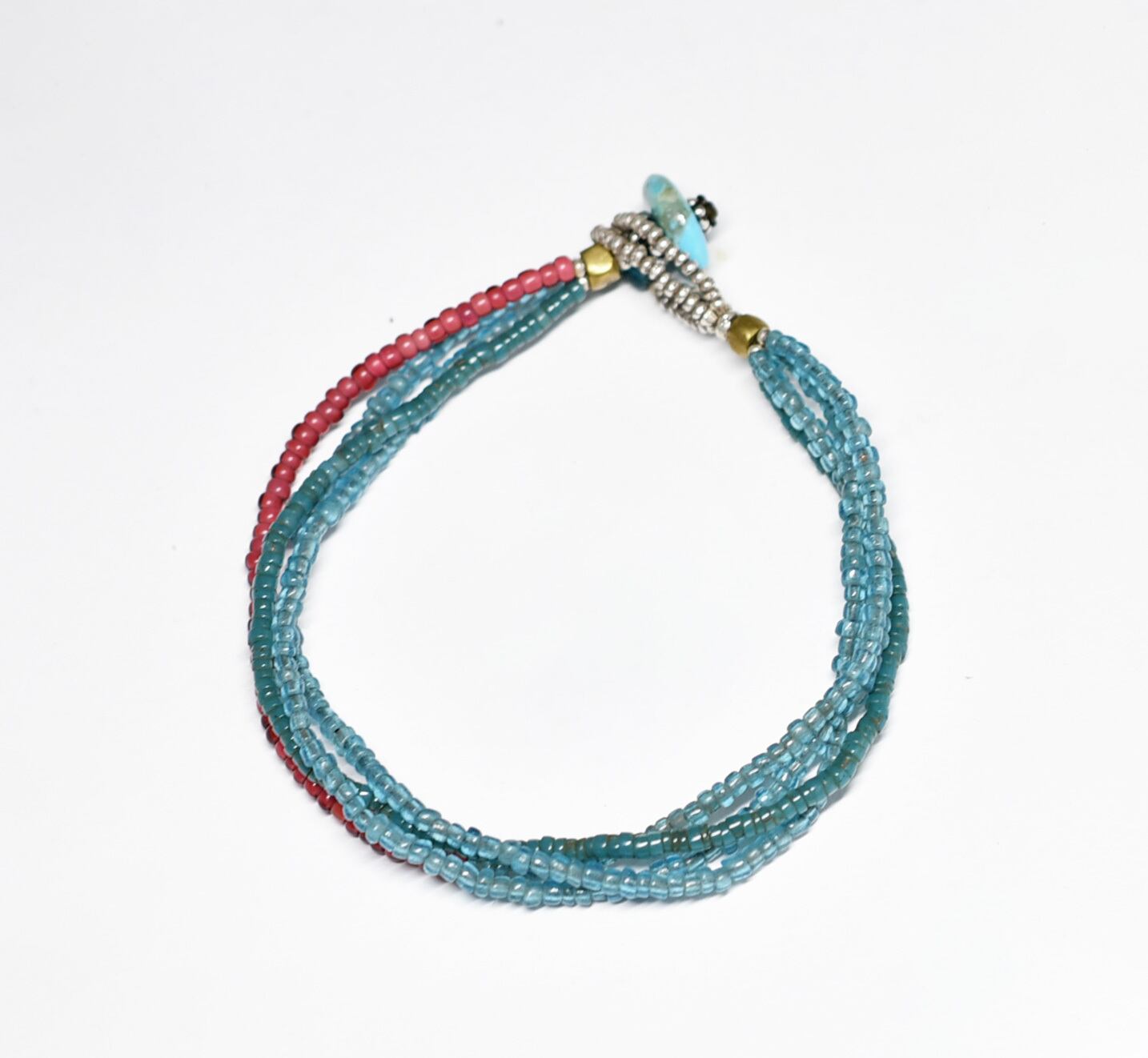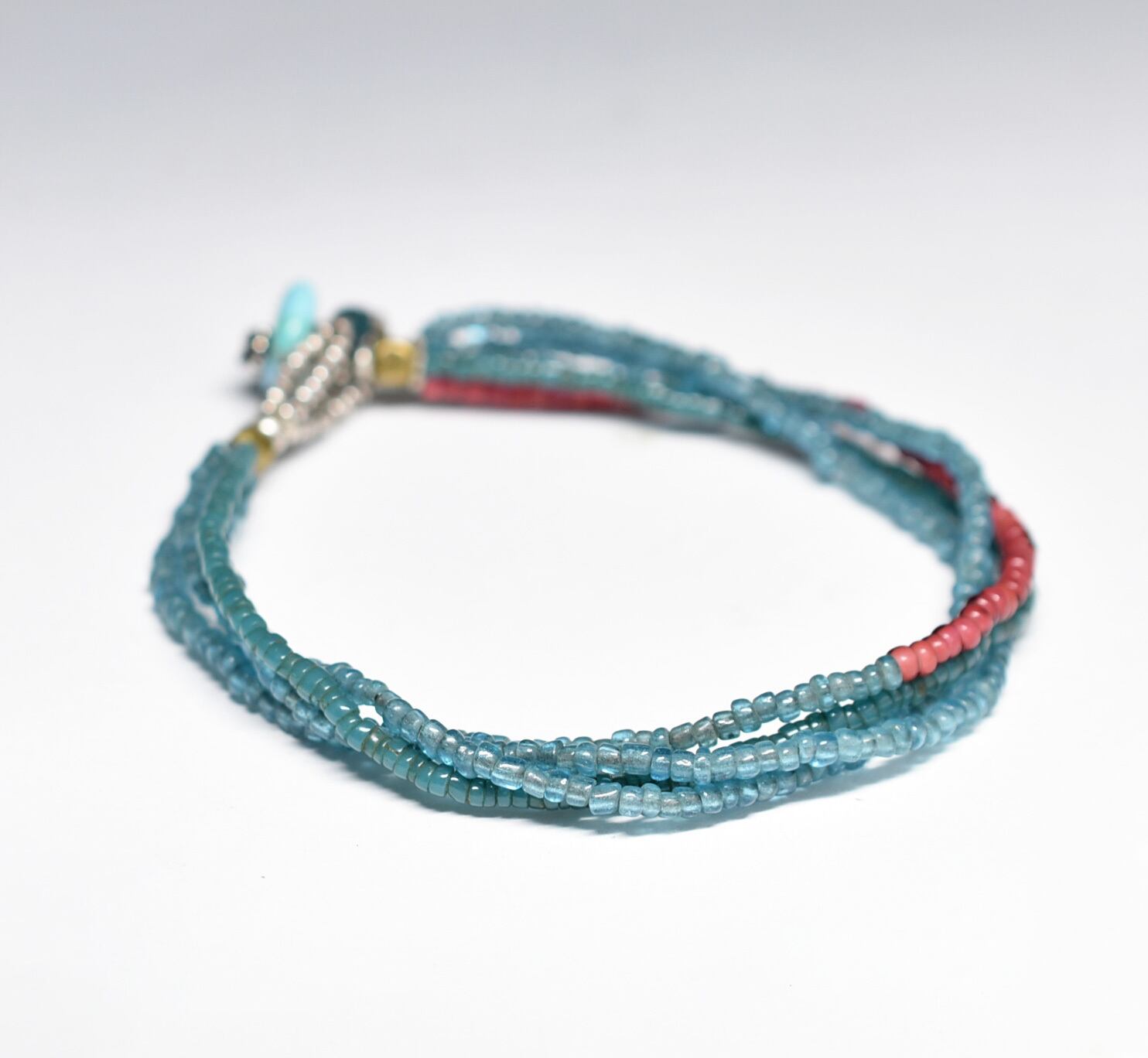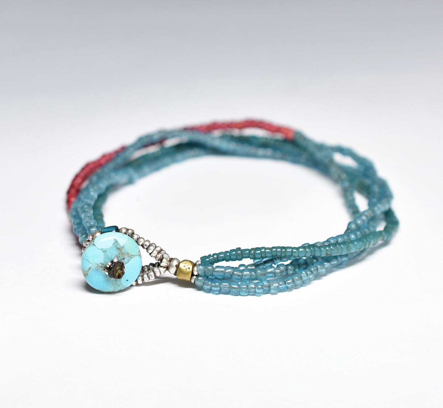 留め金部分のエメラルドブルービーズはインドパシフィックビーズと呼ばれるアンティークビーズです。インドパシフィックビーズの起源は、紀元前2世紀と言われています。こちらのビーズはインドネシアの出土品です。年代はなんと!10世紀頃なので1000年前以上のビーズです!