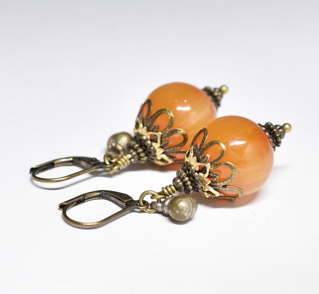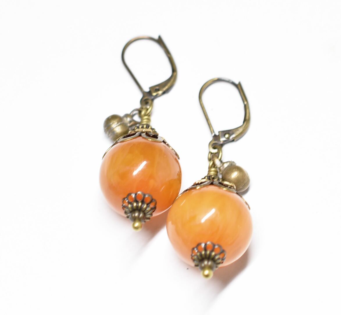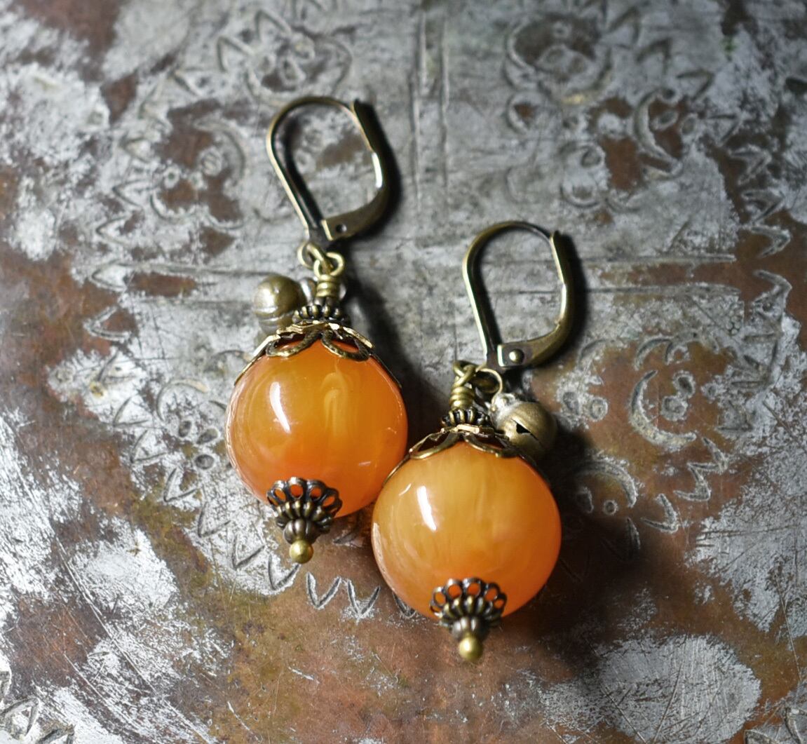 まん丸艶やかなアフリカンアンバーと民族鈴のピアス(淡)