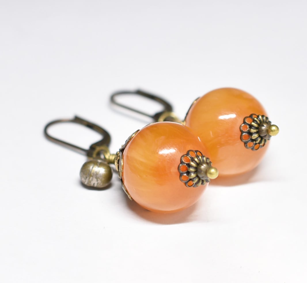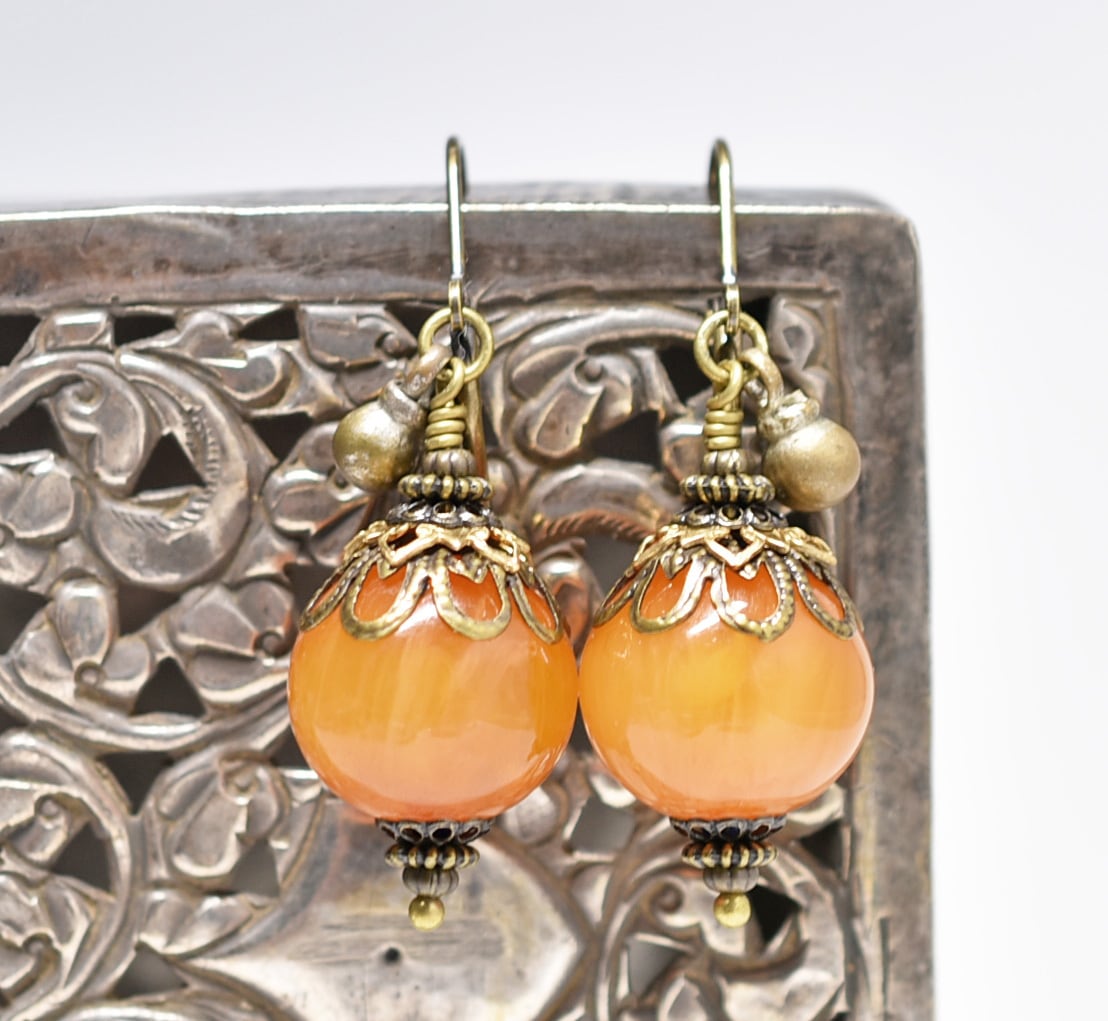 まん丸艶やかなアフリカンアンバーと民族鈴を繋いだピアスです。