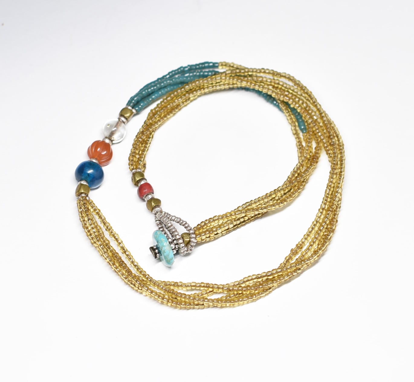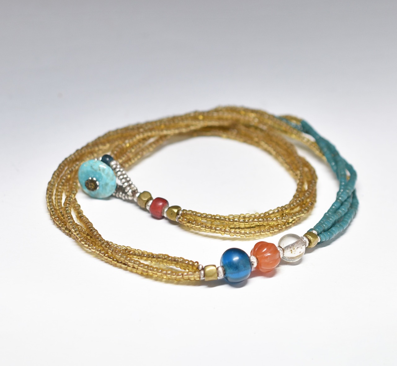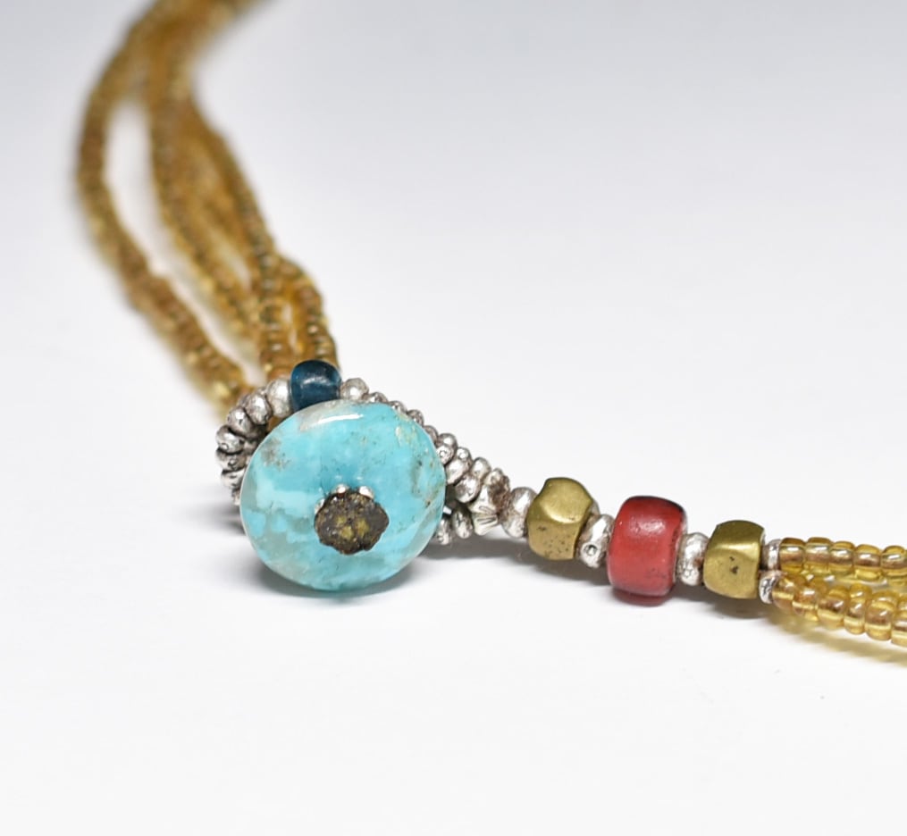 素材:ガラス、ヴィンテージカーネリアン、カレンシルバー、oldオリッサブラス、ターコイズ、ロウビキ紐