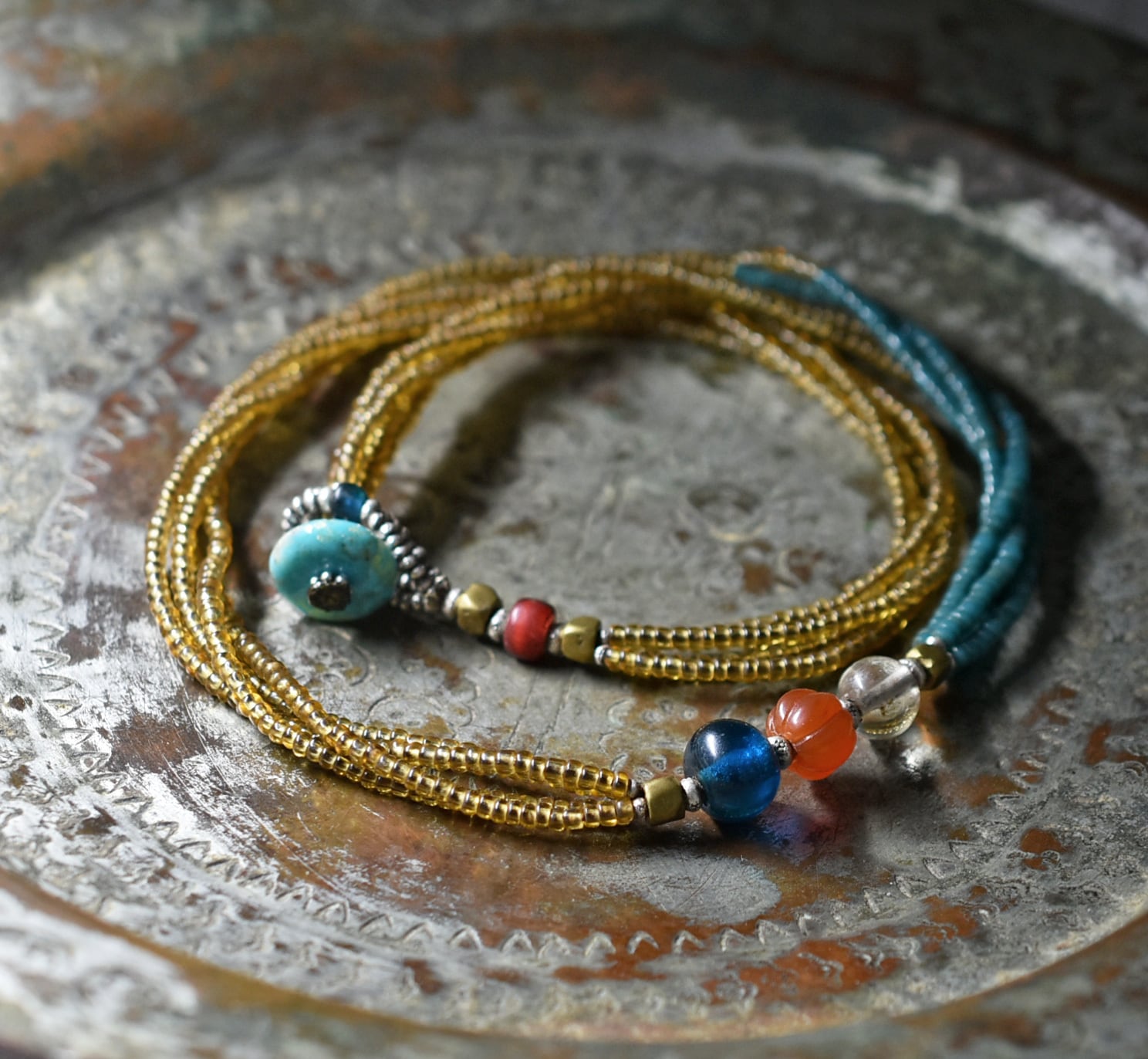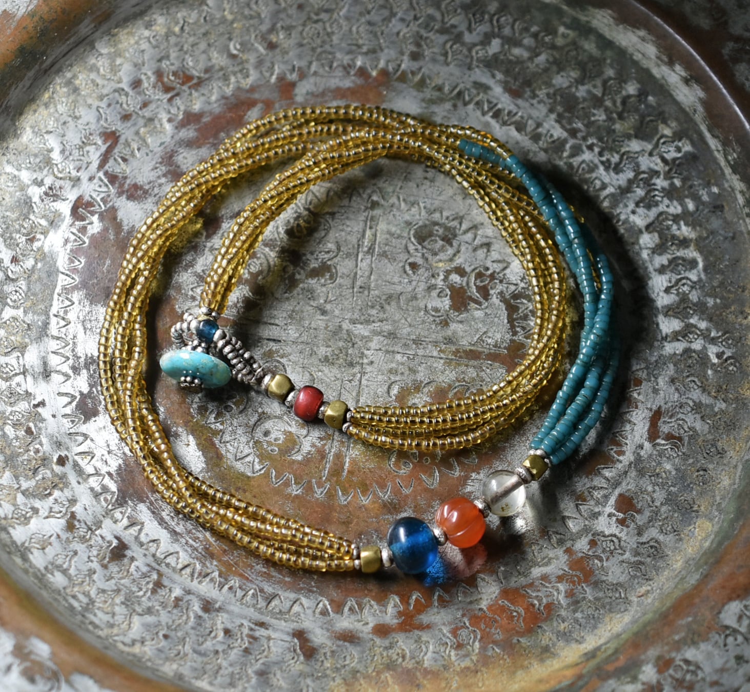 琥珀色とピーコックブルーのビーズはインドの古いシードビーズです。