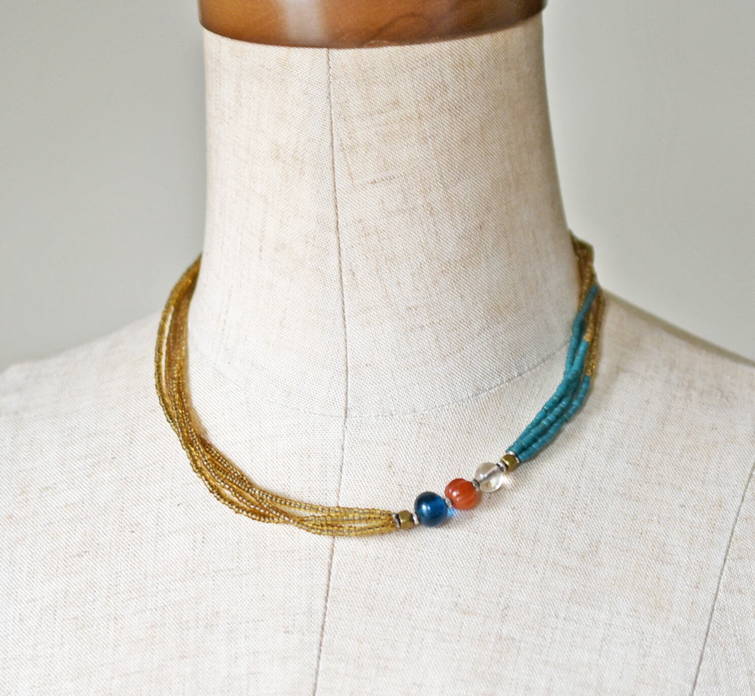 ヴィンテージブルー&クリアビーズ&蜜柑玉カーネリアン、金赤ホワイトハーツ、琥珀&ピーコックブルービーズなどを繋いだ4連のネックレスです。