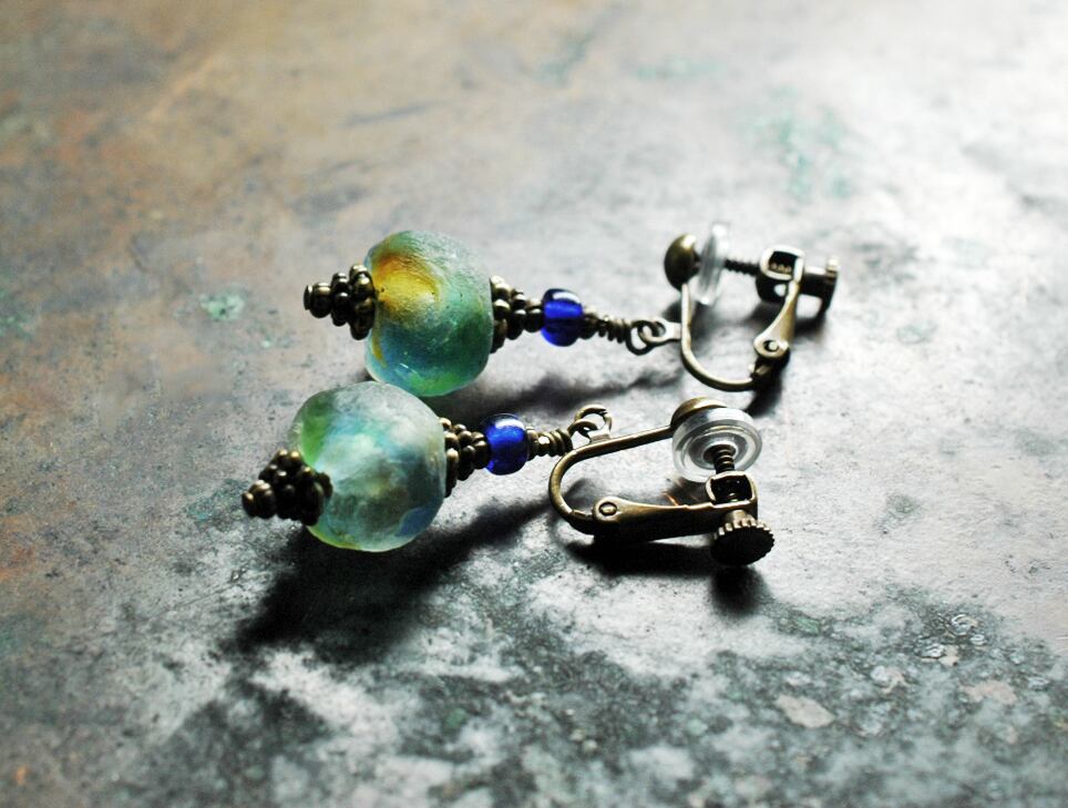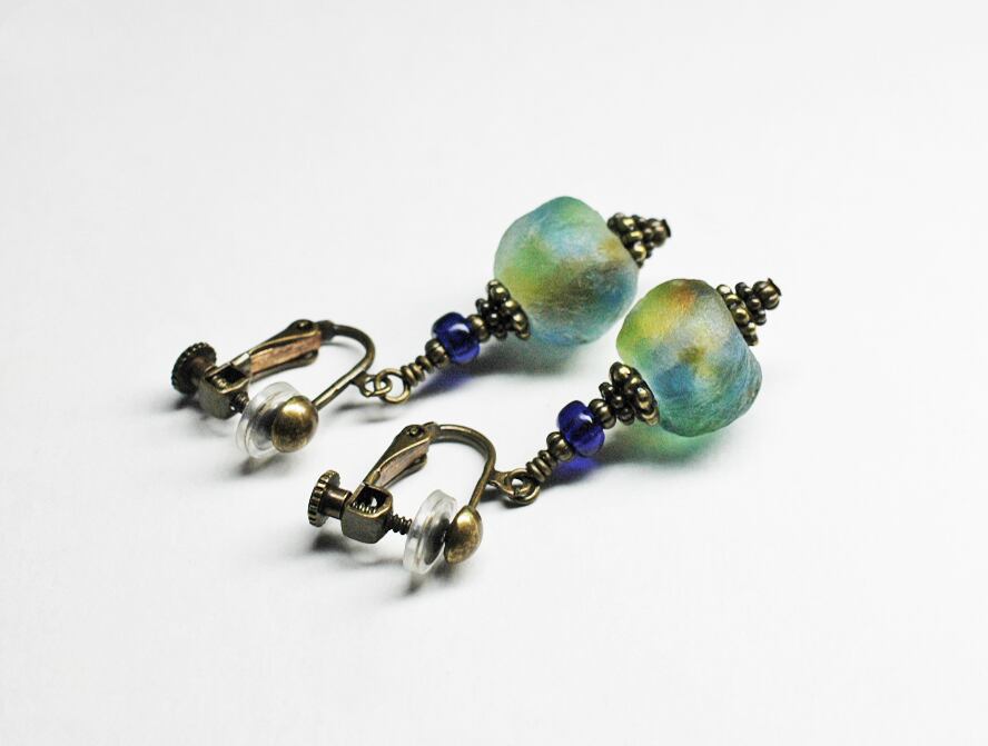 ガーナから届いた再生ガラスビーズを使ったイヤリングです。