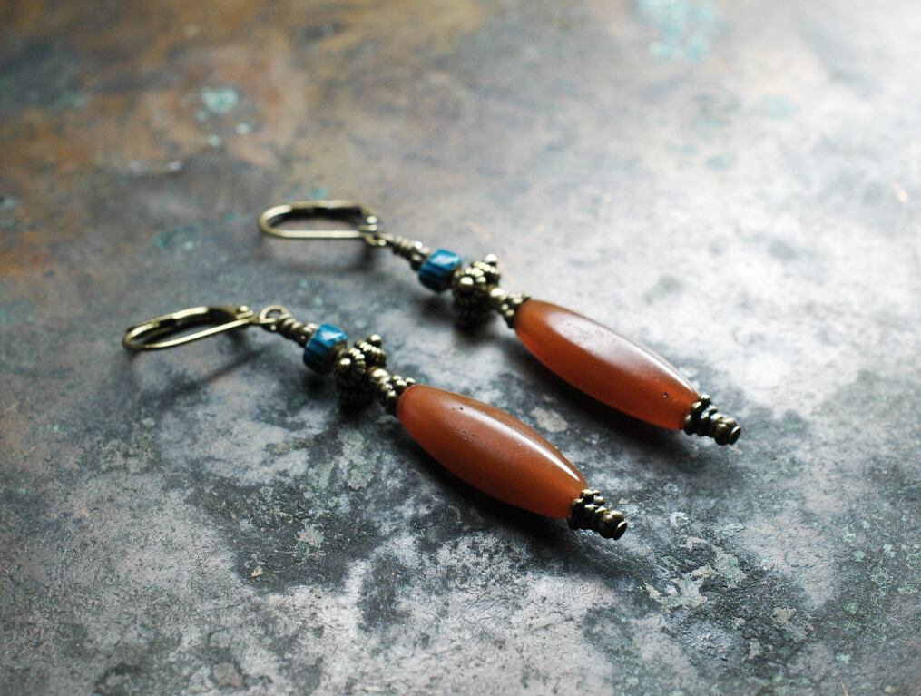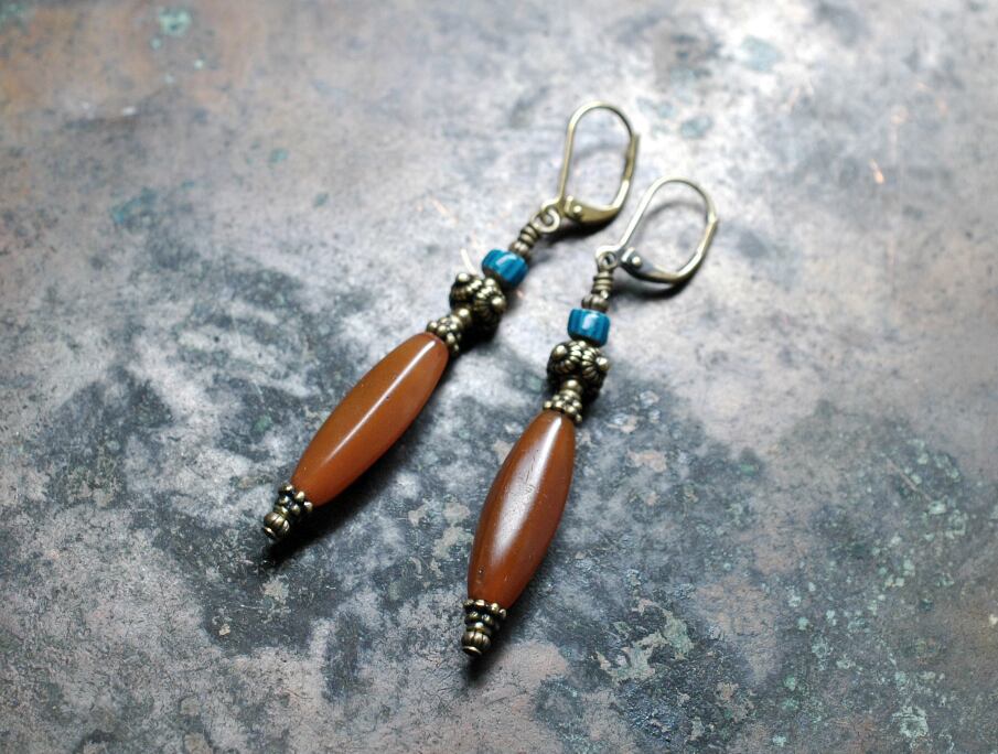 枯葉色のボヘミアビーズとグリーンシェブロンのピアス
