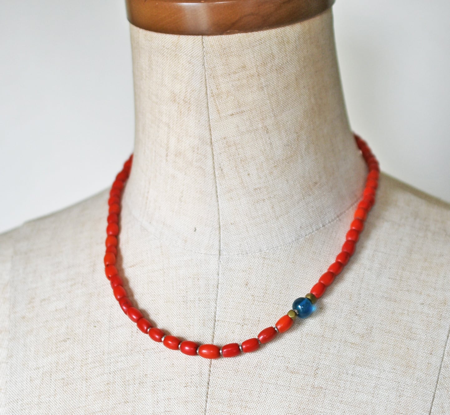 ナガ族グラスコーラルビーズ、ブルーヴィンテージビーズ、oldオリッサブラスなどを繋いだネックレスです。