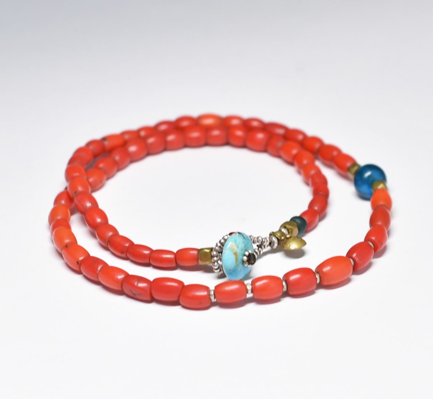 ナガ族グラスコーラルビーズ、ブルーヴィンテージビーズ、oldオリッサブラスのネックレス(ターコイズビーズ留め金)