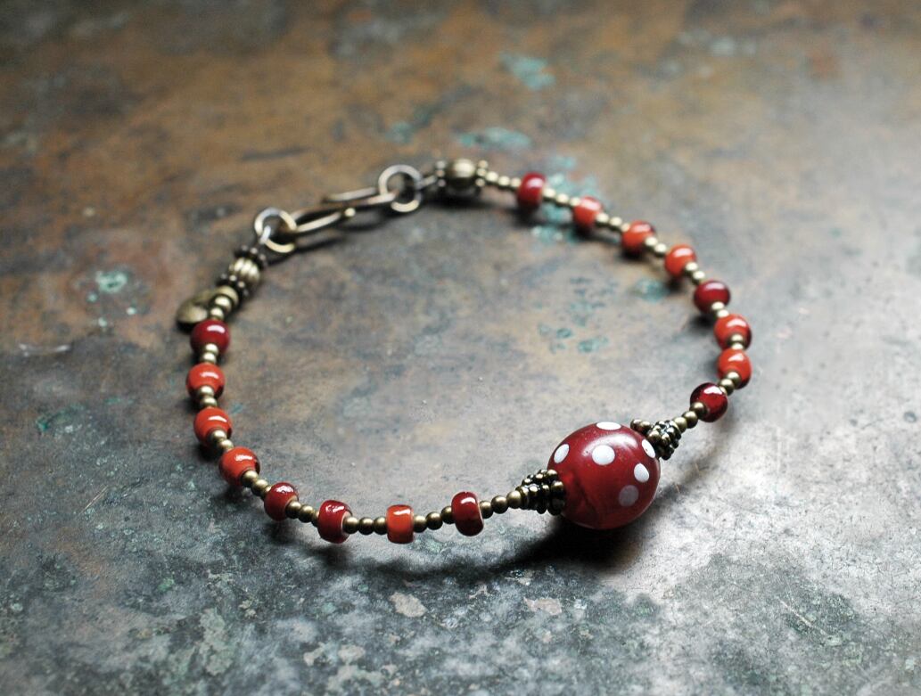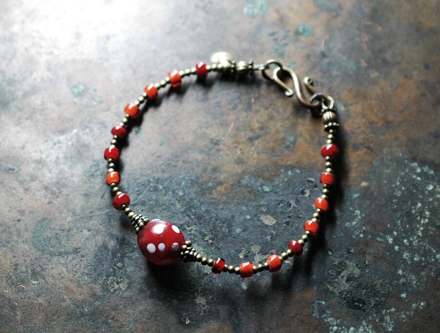 水玉模様がとっても可愛らしい、ボルドー色アンティークビーズと、アンティークのホワイトハーツで繋いだブレスです。
