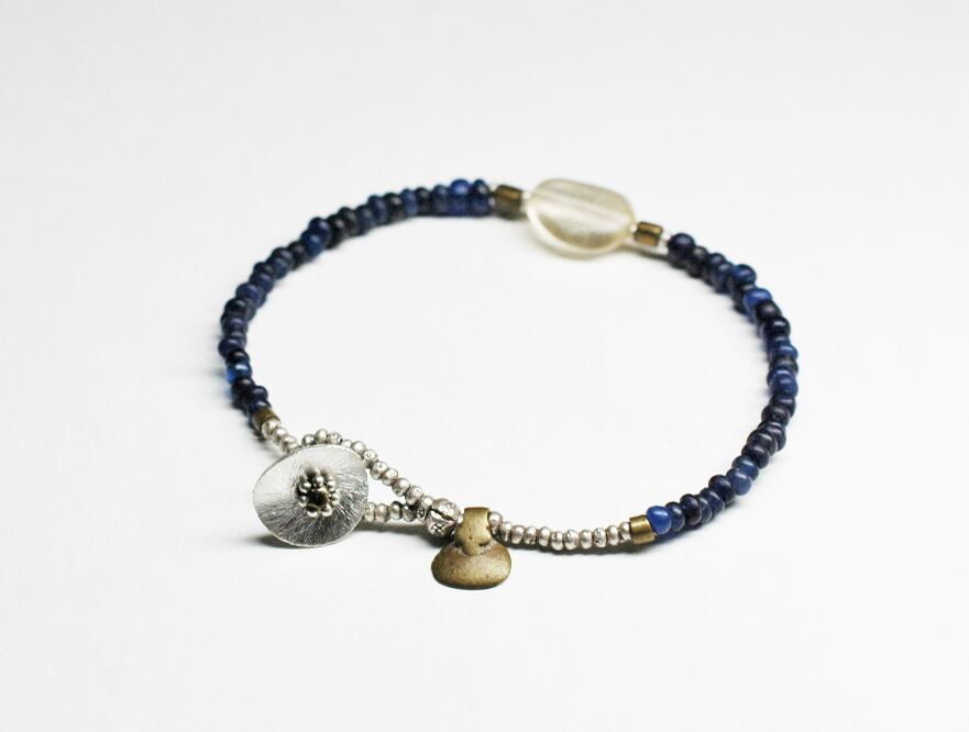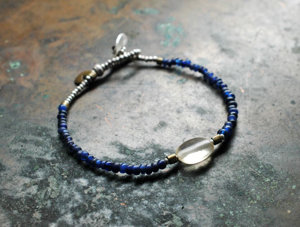 ダークブルーのアンティークビーズと、一粒の古代水晶を繋いだブレスです。