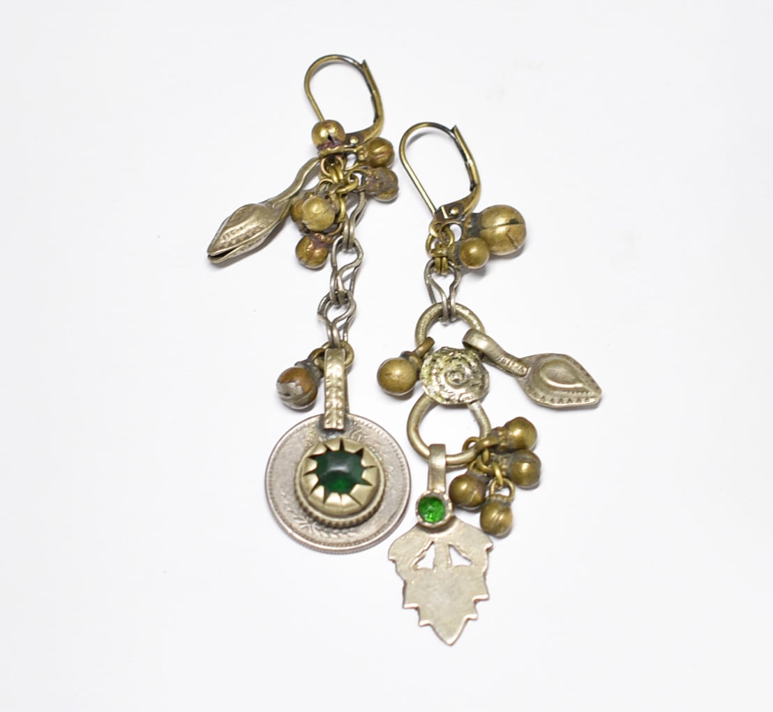 oldコインと多彩oldアフガンメタル、民族鈴を繋いだアンシメトリーなピアスです。