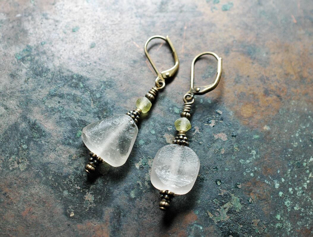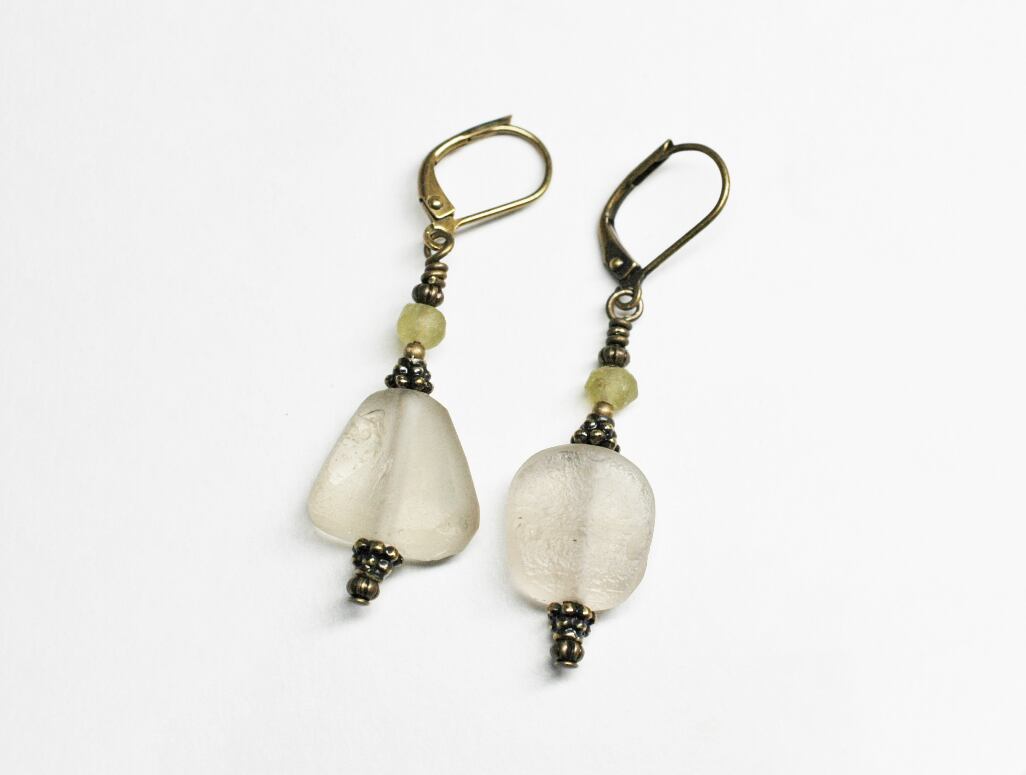 素朴な雰囲気のローマングラスのアンシメトリーピアス(淡い黄緑色)