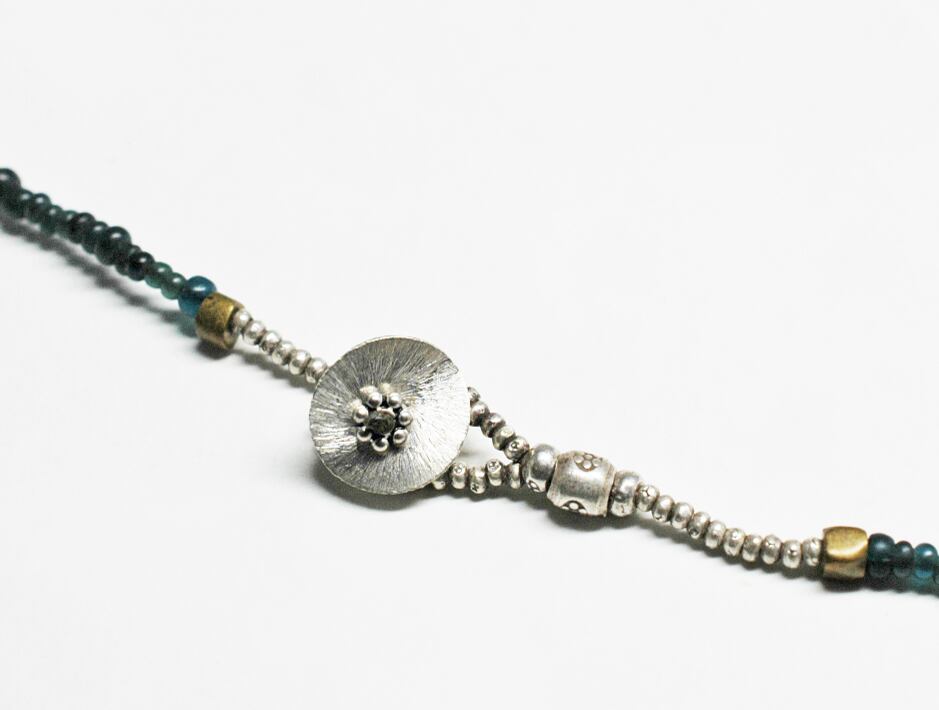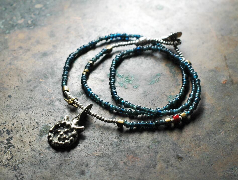 古いインドから届いたシルバートップと、インディゴブルーのアンティークビーズと、濃赤色のホワイトハーツを一粒入れたネックレスです。