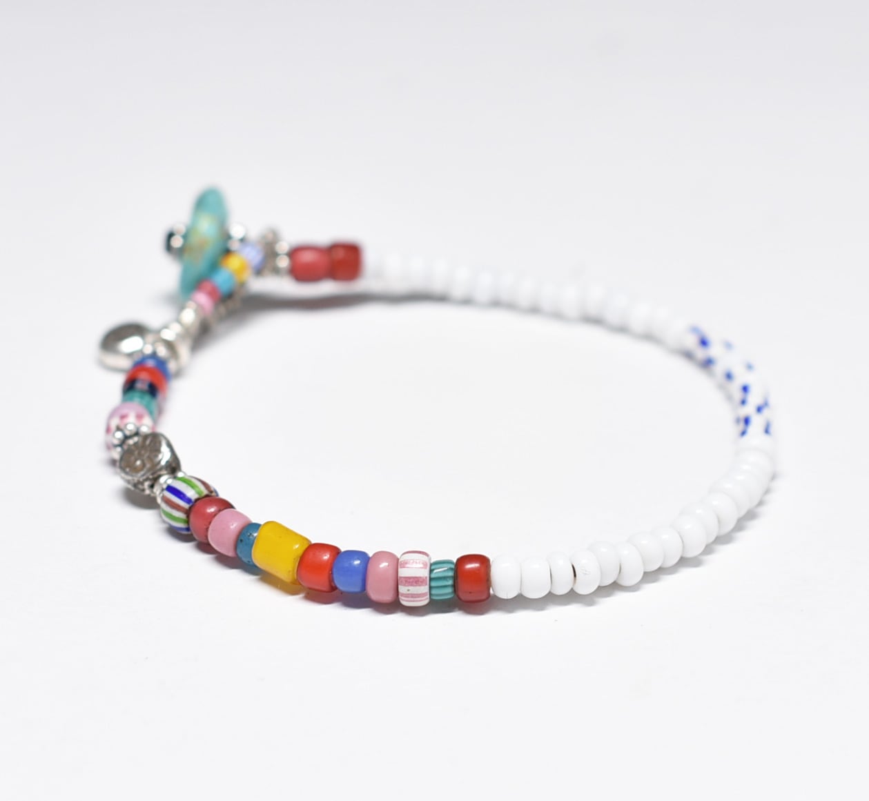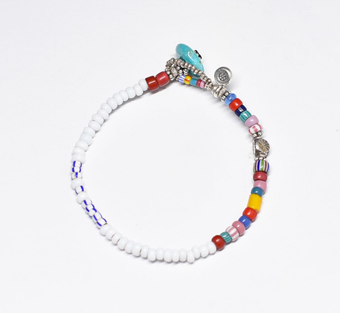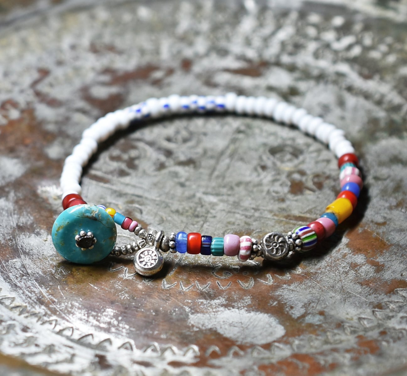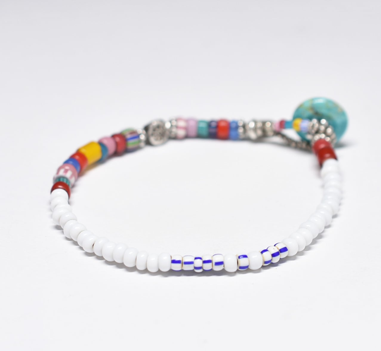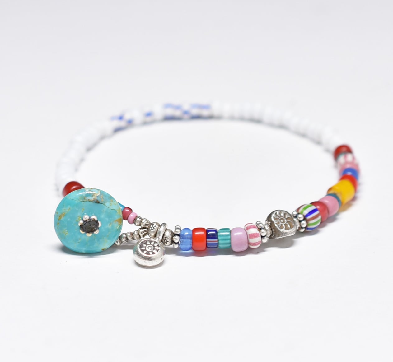 ホワイト&多彩アンティークヴェネチアビーズのブレス(太陽・ターコイズ留め金)