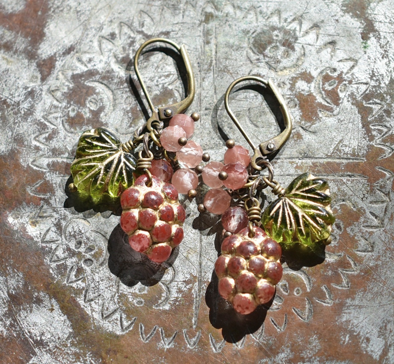 葡萄と葉っぱのビーズはチェコ産のガラスビーズです。