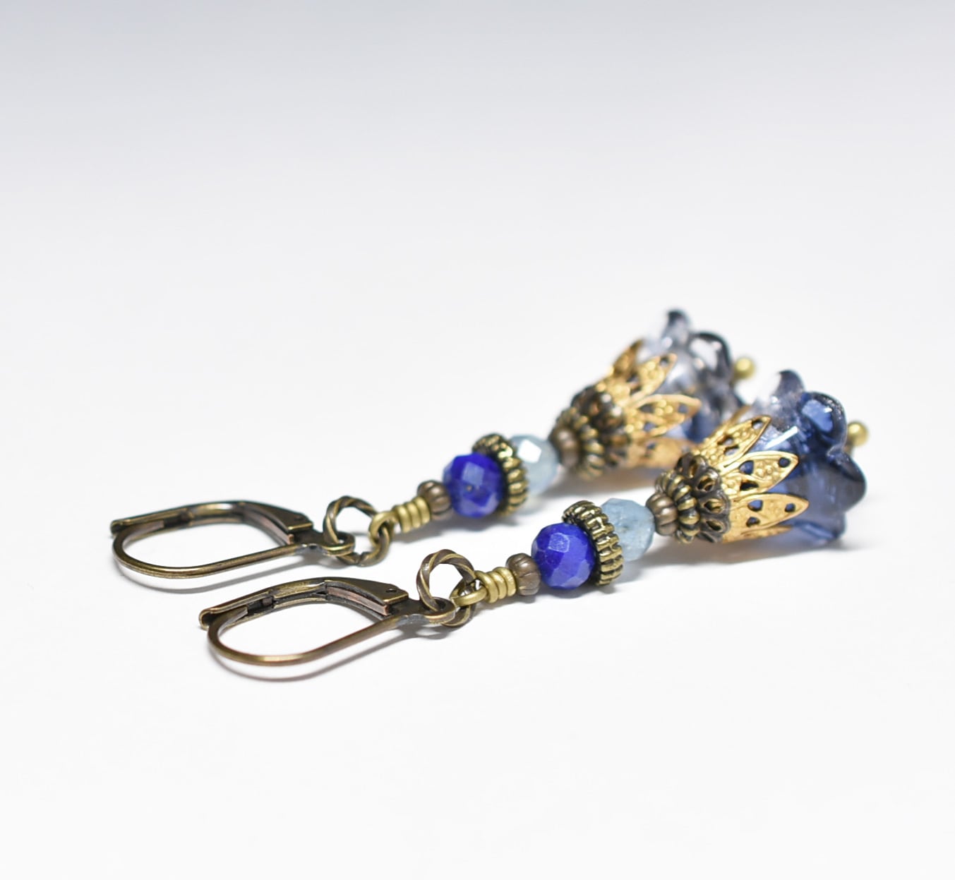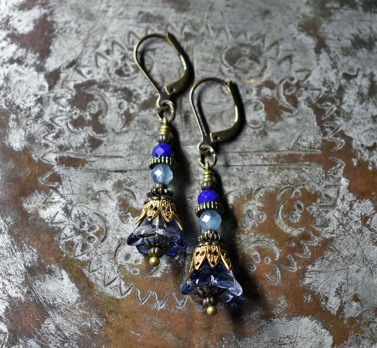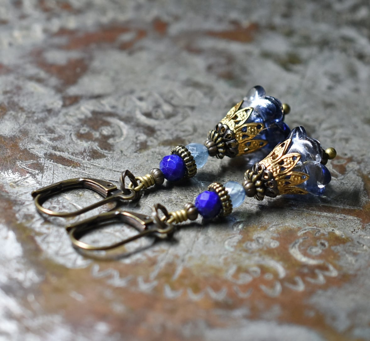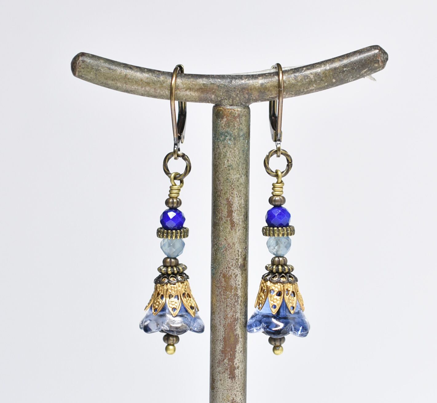 お花japanヴィンテージビーズとラピス&アクアマリンのピアス