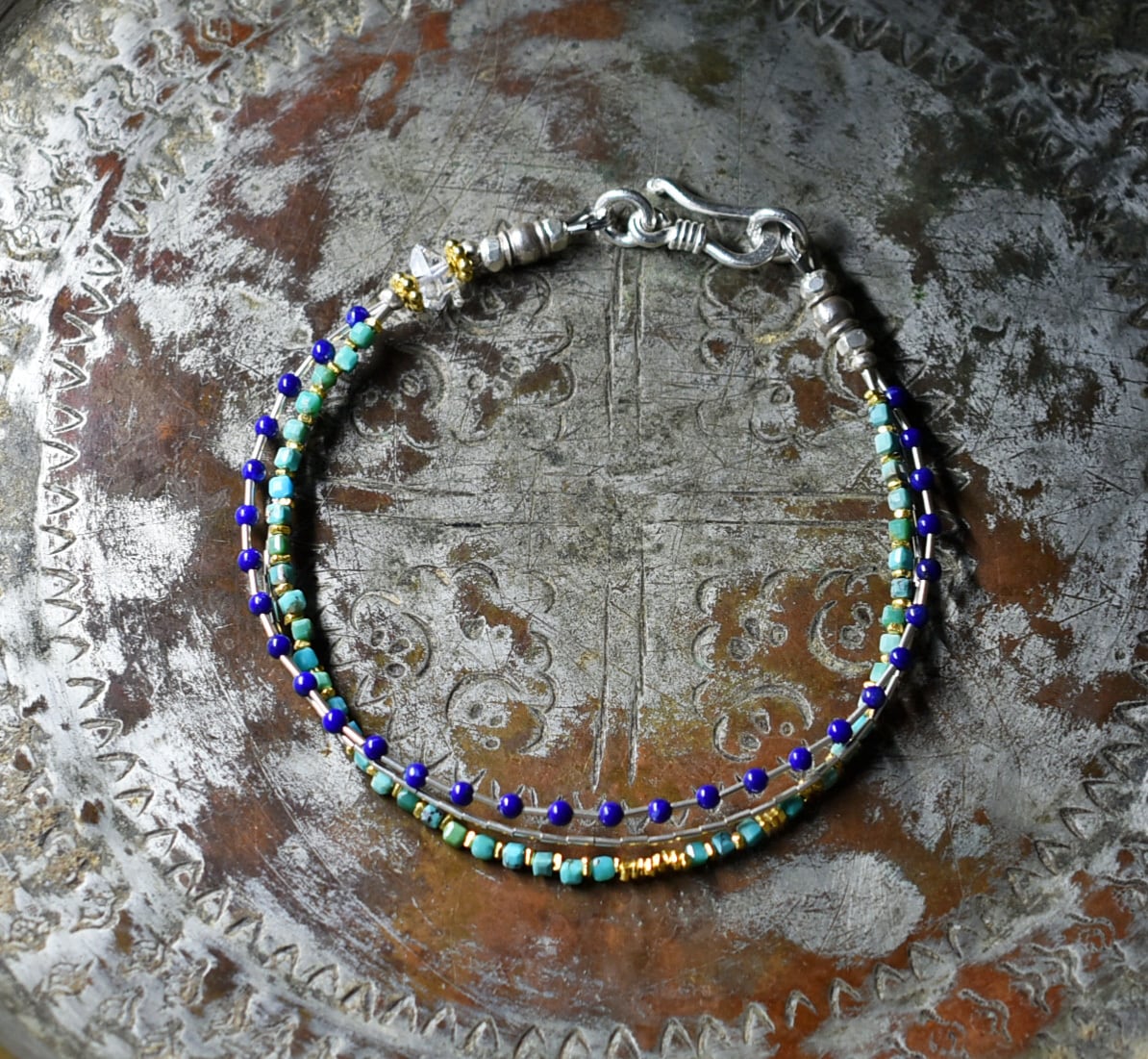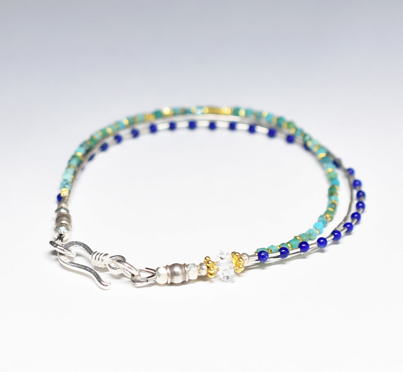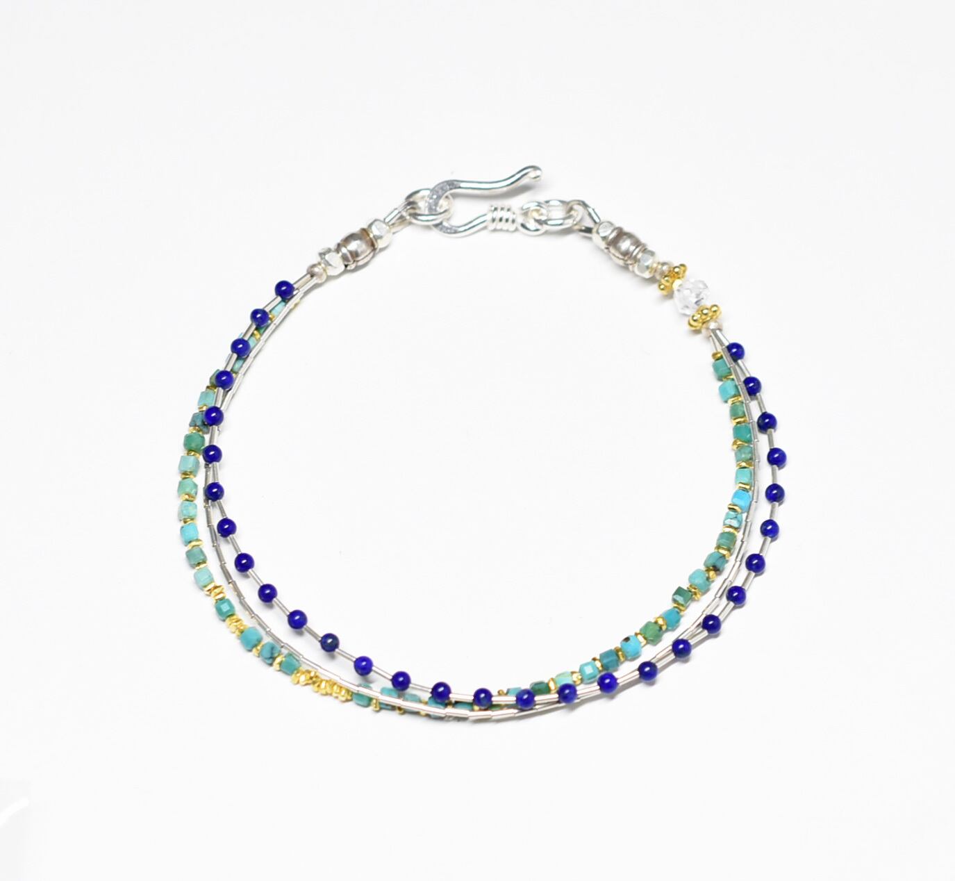 ターコイズ&ラピスラズリ、繊細筒型シルバービーズ、カレンシルバー、ハーキマーダイヤモンドの3連ブレス