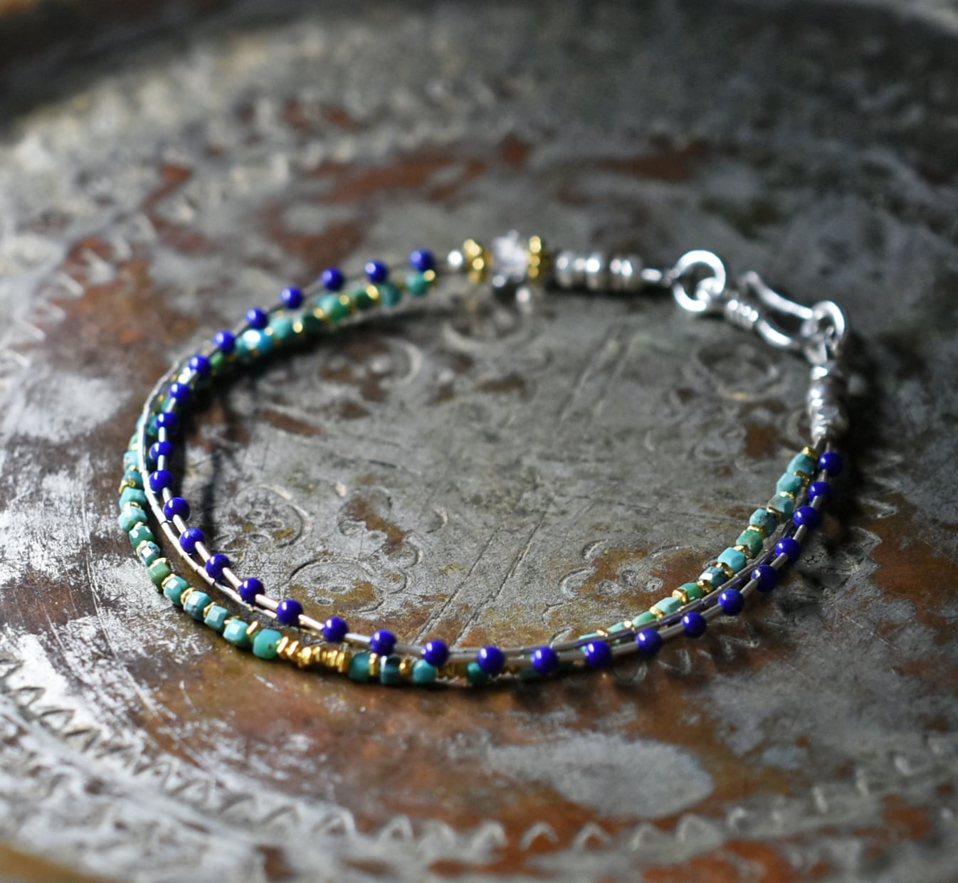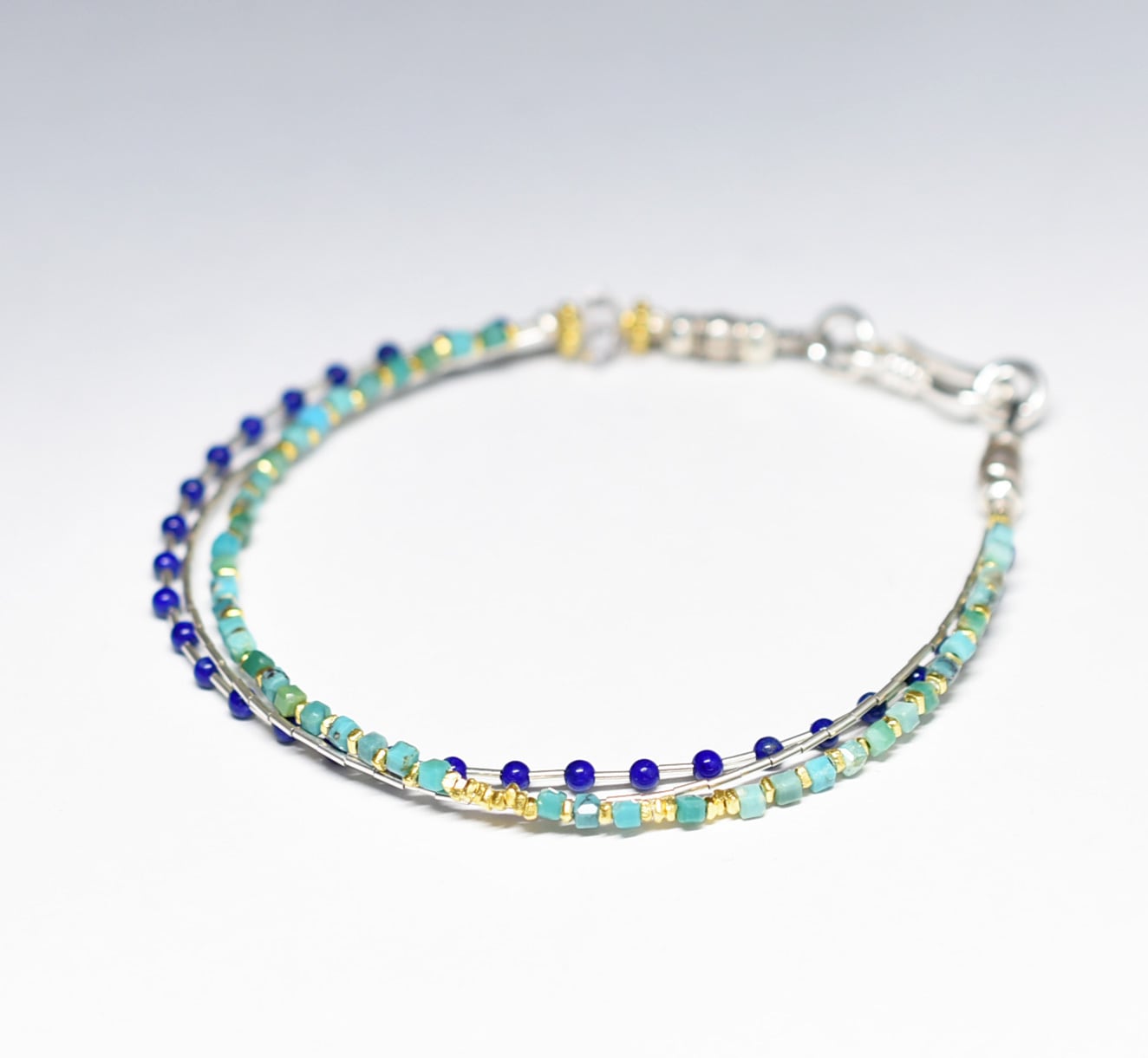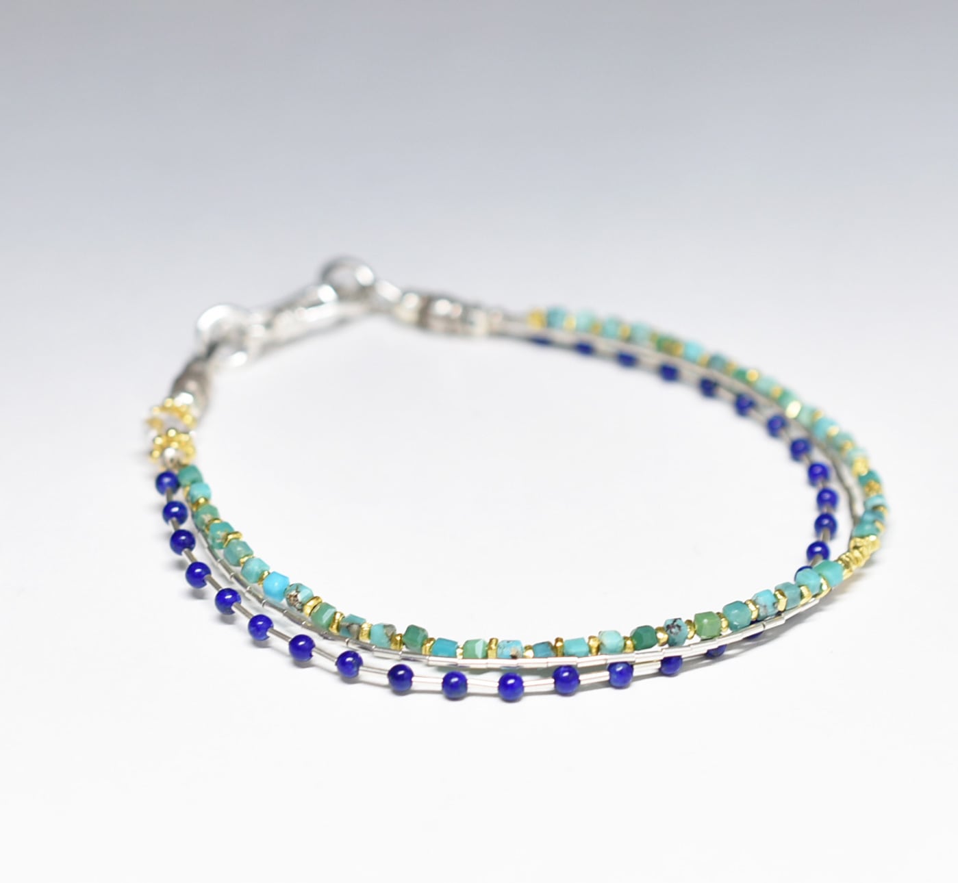 ターコイズ&ラピスラズリ、繊細筒型シルバービーズ、カレンシルバー、ハーキマーダイヤモンドの3連ブレス
