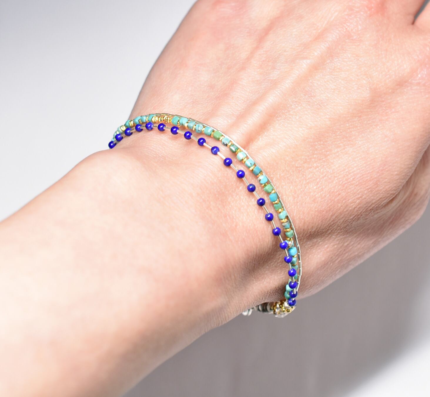 小さなストーンビーズと繊細なシルバーが手元を彩るブレスです。
