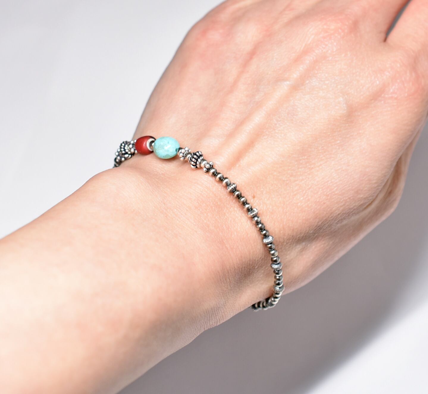 素材:ナバホパール、キングマンターコイズ、シルバー、カレンシルバー、ガラス、ワイヤー