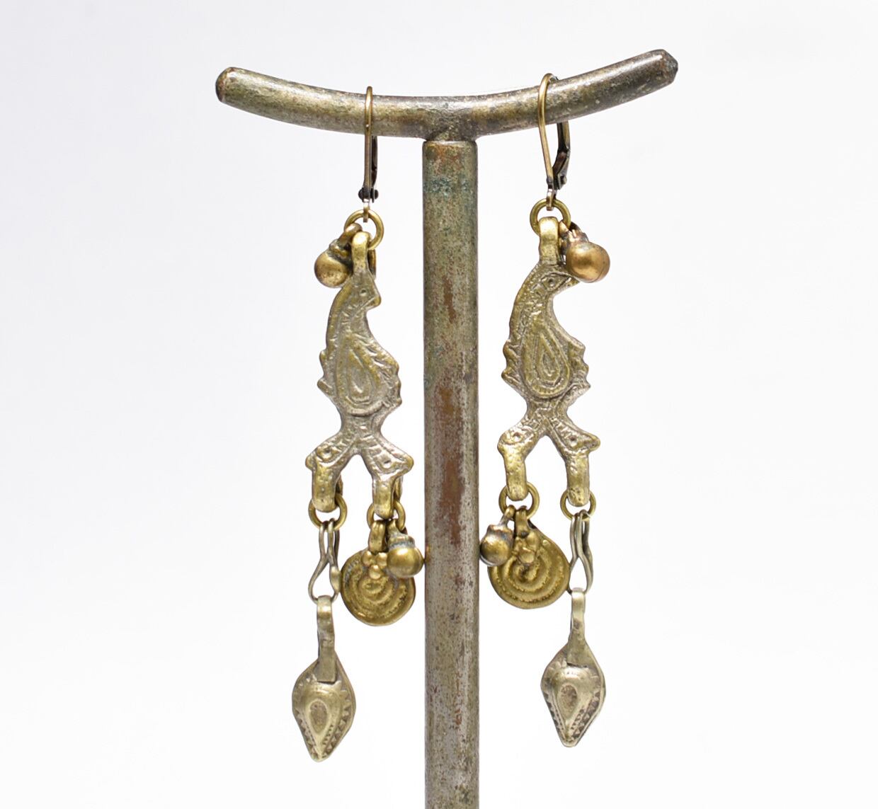 鳥型&多彩oldアフガンメタルパーツ、渦巻きブラス、民族鈴のピアス