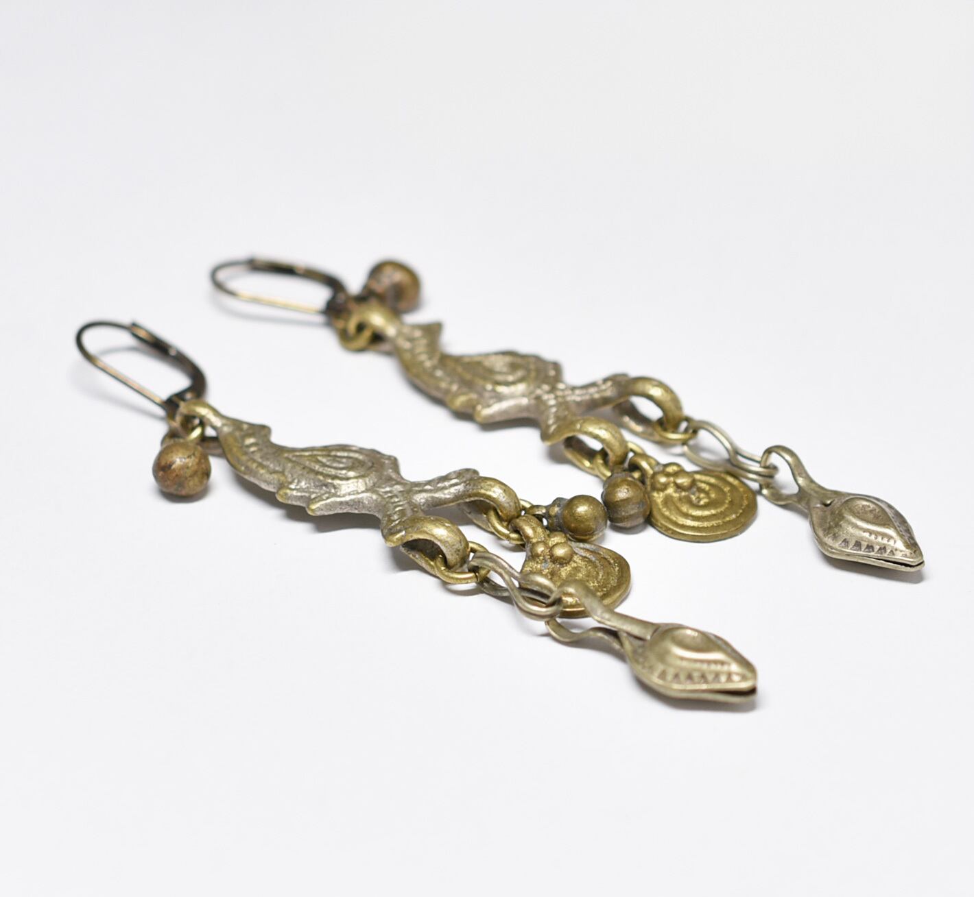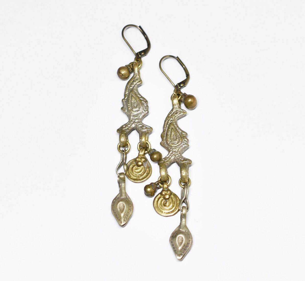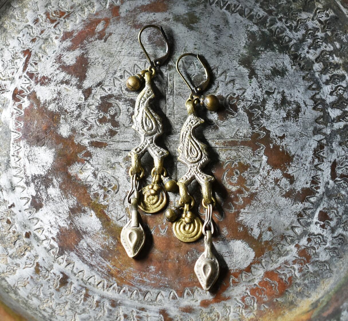 鳥型&多彩oldアフガンメタルパーツ、渦巻きブラス、民族鈴ピアスです。