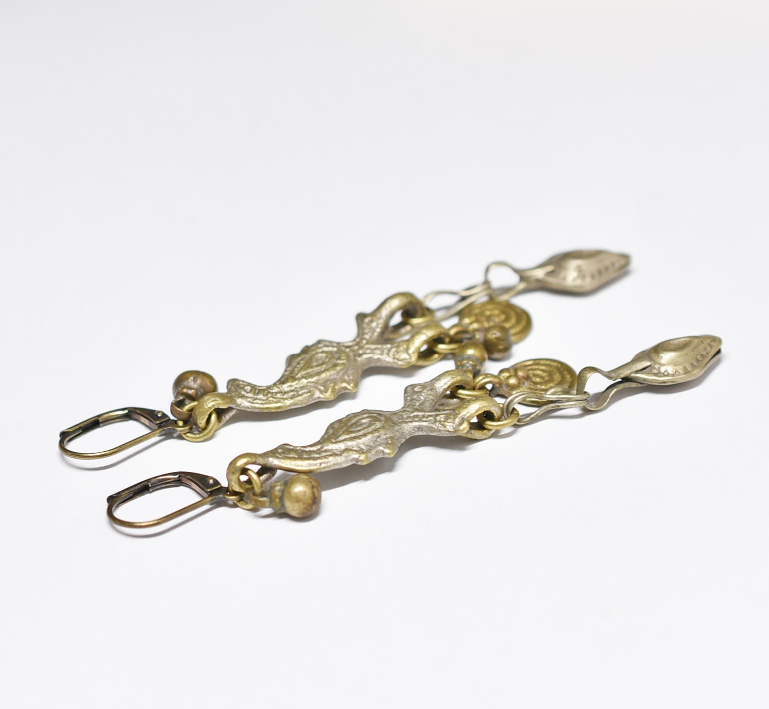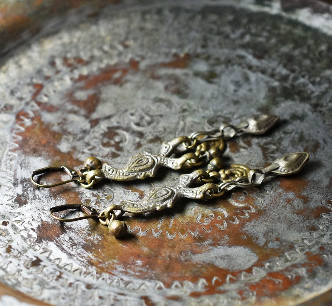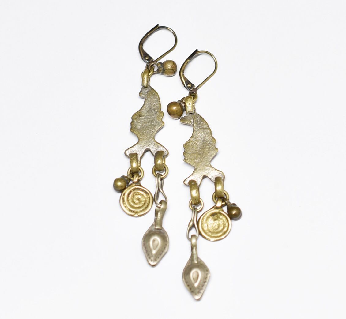 鳥型&多彩oldアフガンメタルパーツ、渦巻きブラス、民族鈴ピアスです。