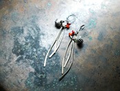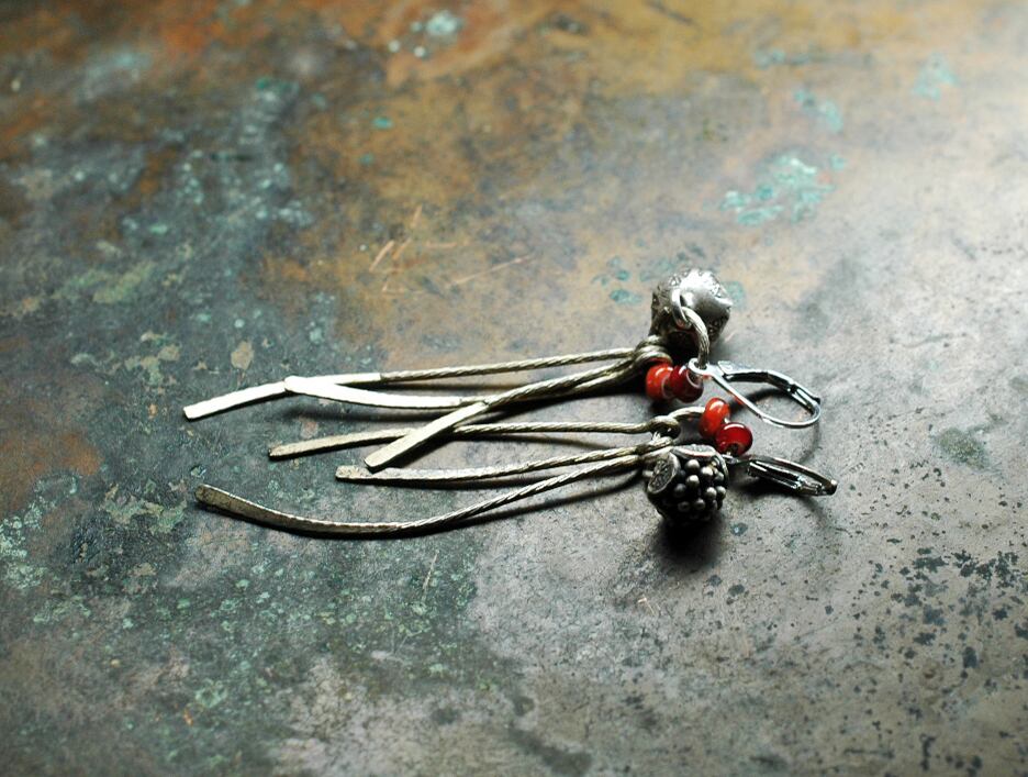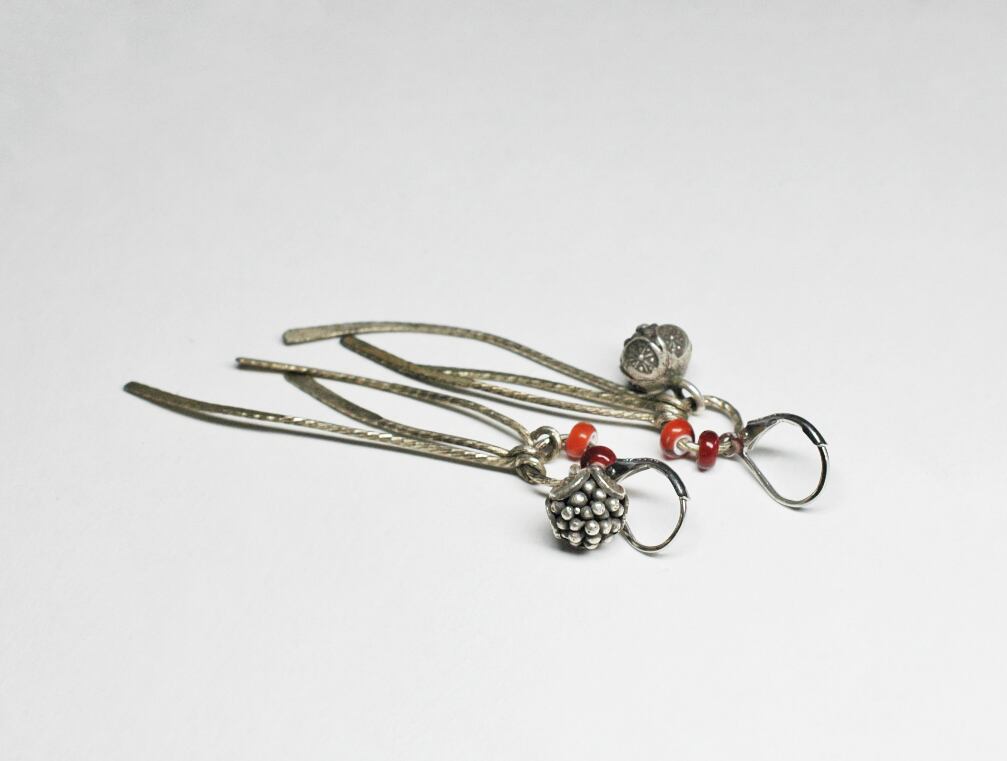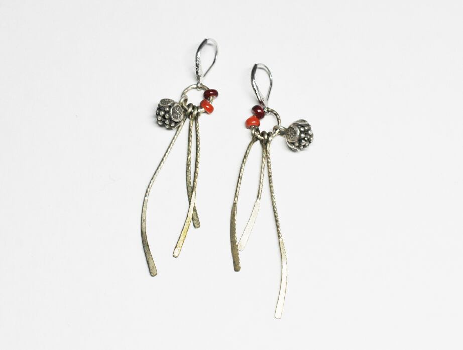 ミャオ族の細長いパーツと、カレンシルバーのコロンと可愛らしいお花パーツ、二粒のアンティークビーズを使ったピアスです。