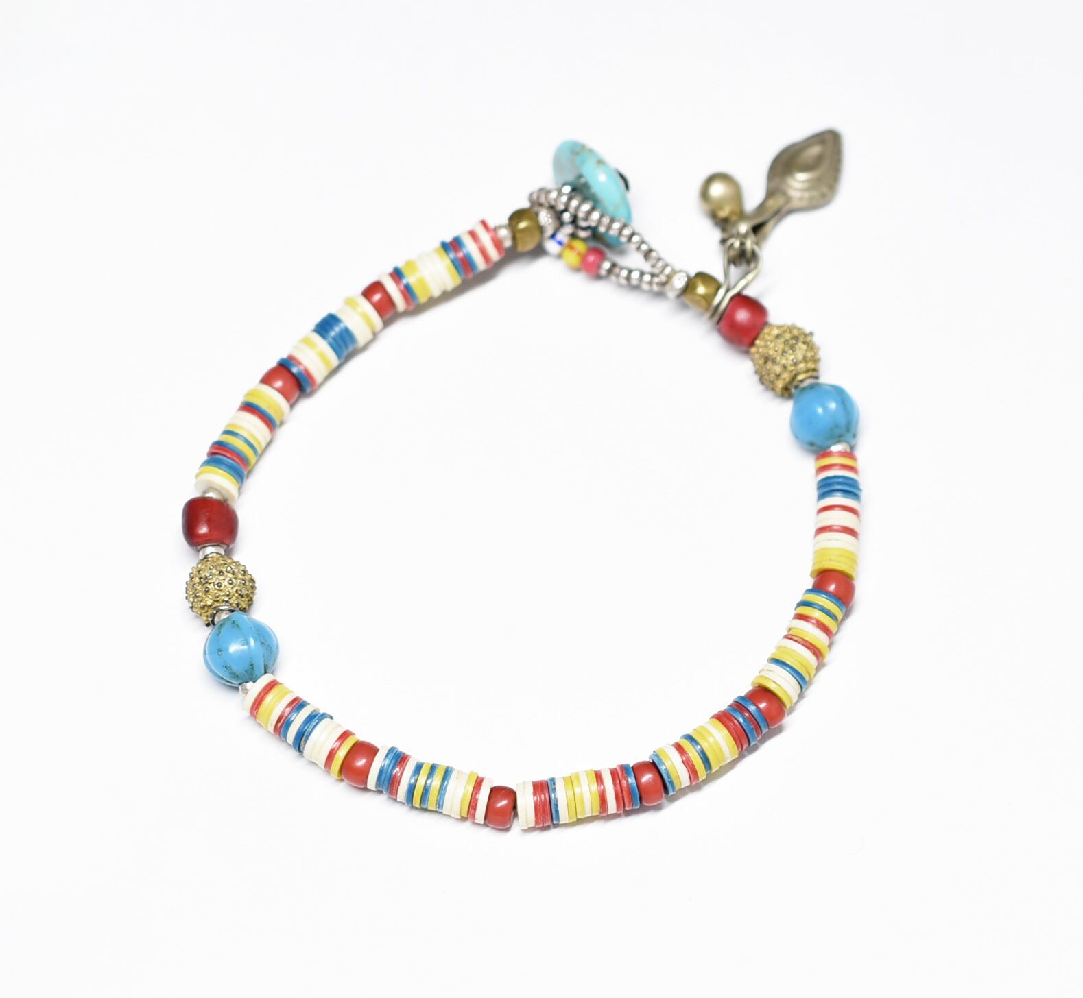 トリコロールカラーレコード盤、ナガ族蜜柑玉、金赤ホワイトハーツ、つぶつぶブラスのブレス(ターコイズ留め金)