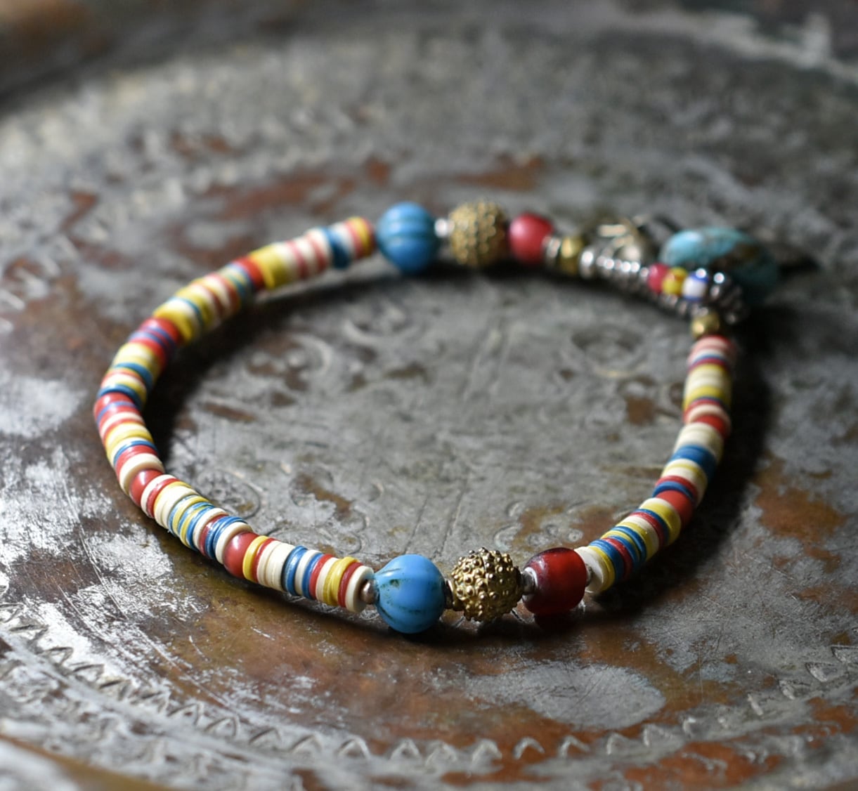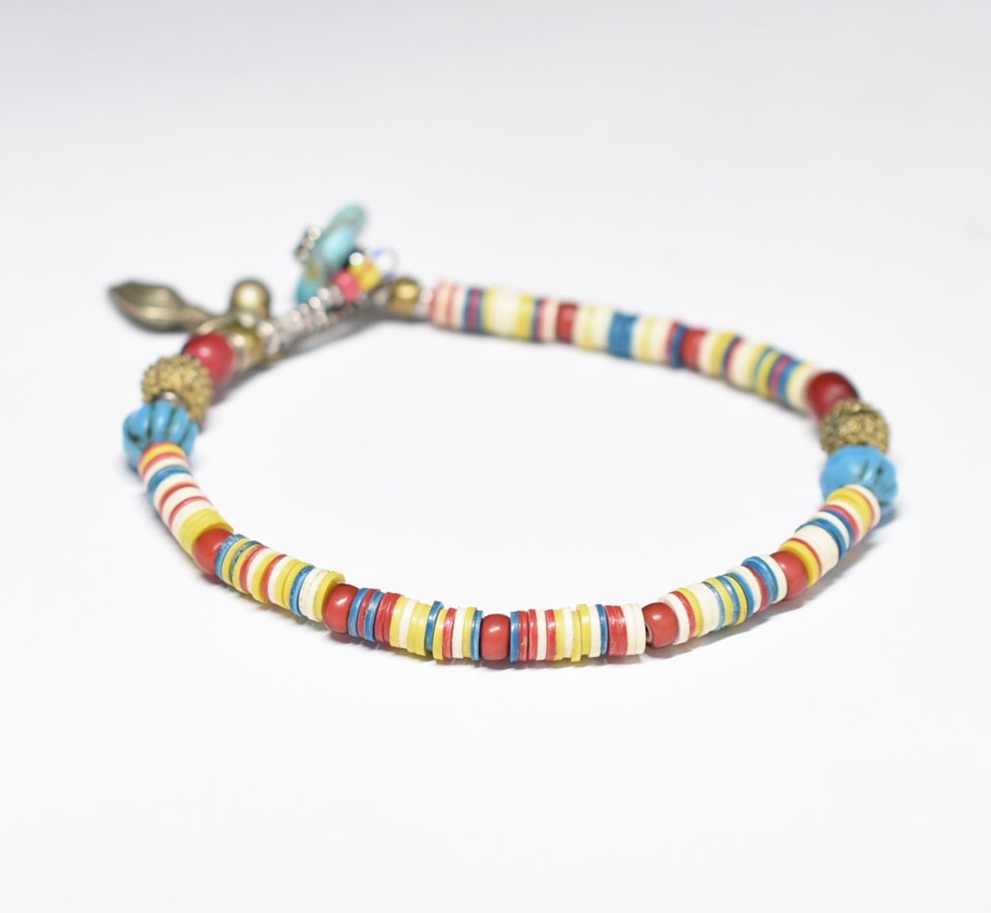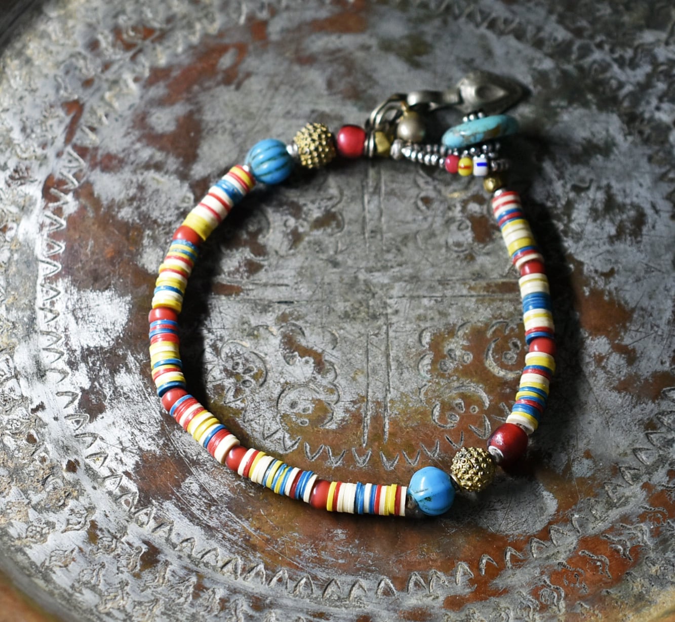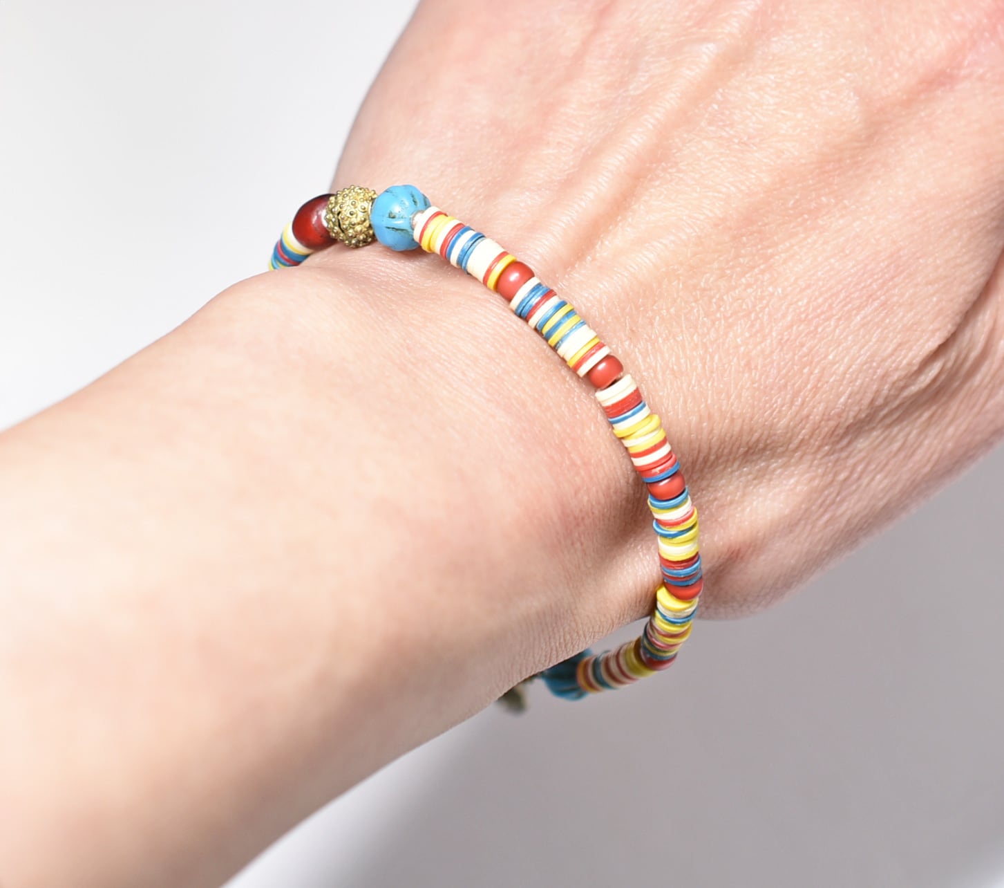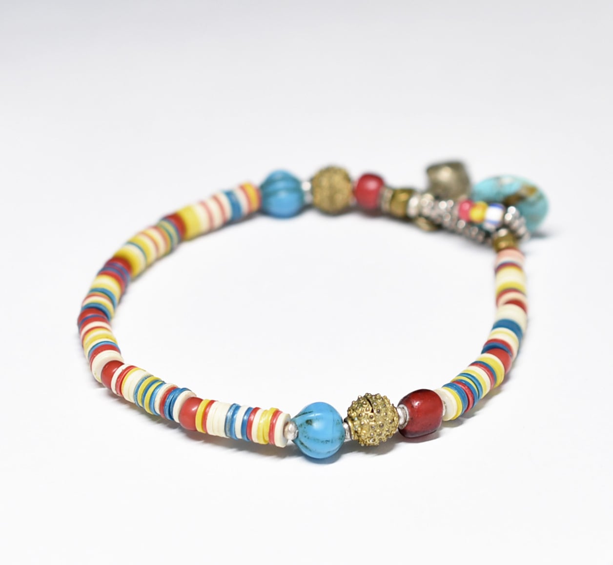 トリコロールカラーレコード盤、ナガ族蜜柑玉、金赤ホワイトハーツ、つぶつぶブラスなどを繋いだブレスです。