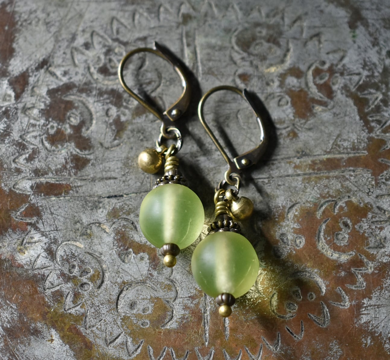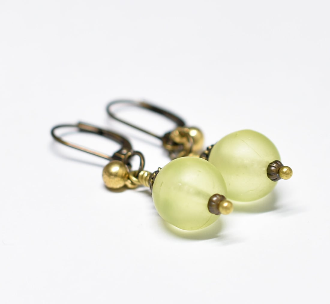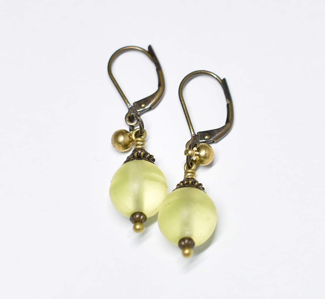 コロンと丸いアンティークウランガラスとまん丸インドブラスのピアス