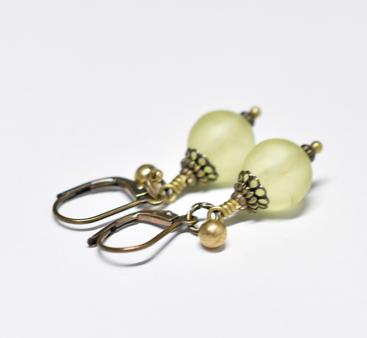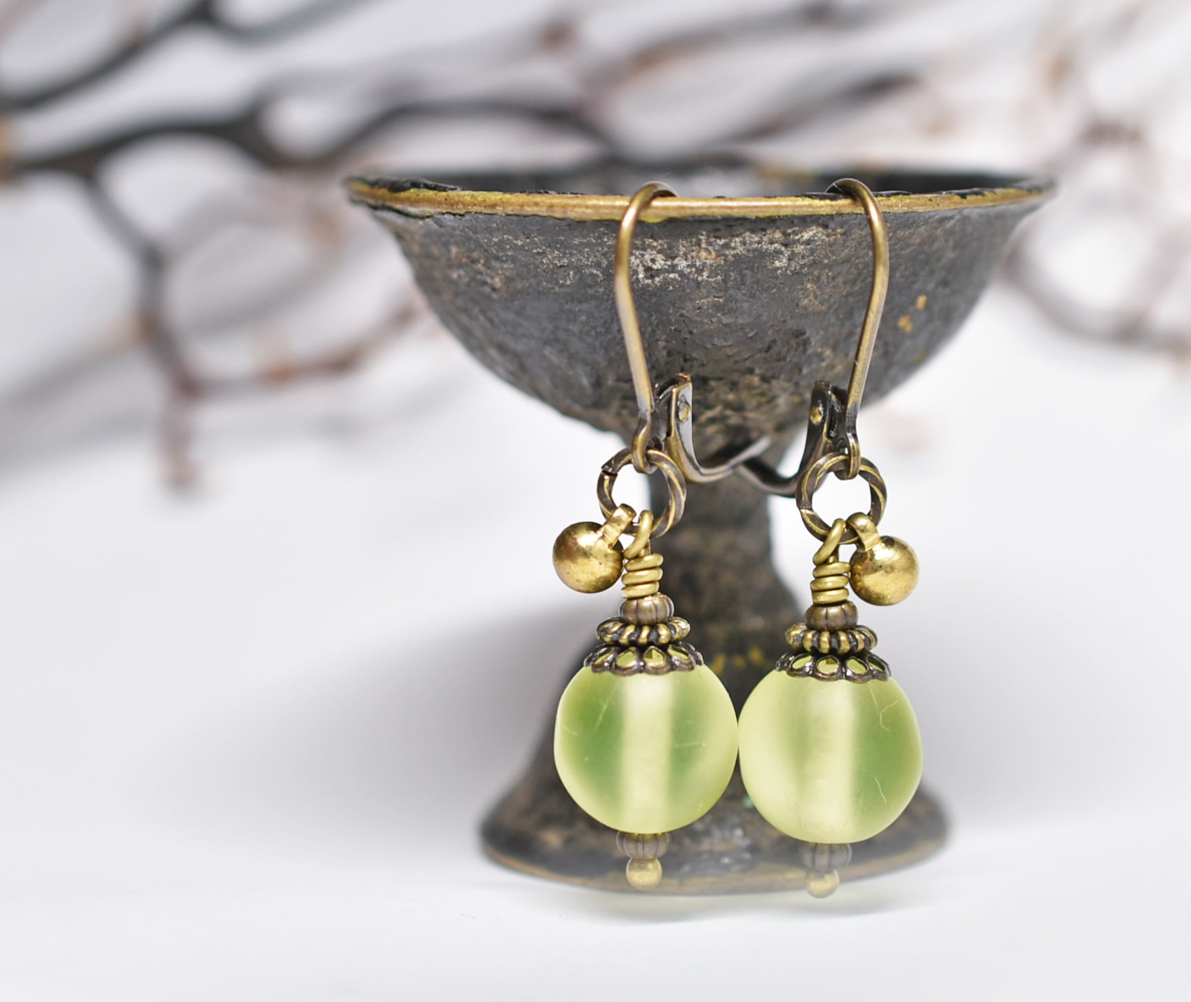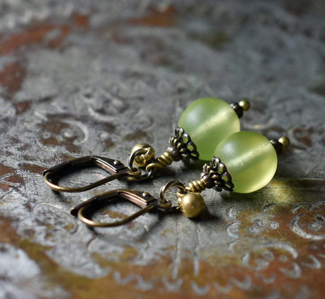 コロンと丸いアンティークウランガラスとまん丸インドブラスのピアス