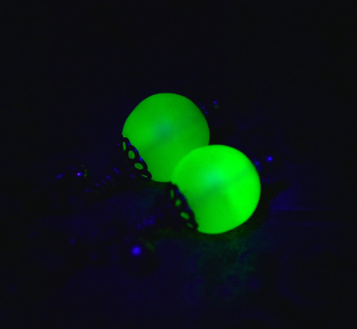 独特なセミクリアイエローのビーズは、極々微量のウランで発色させています。ブラックライトを当てると光ります!