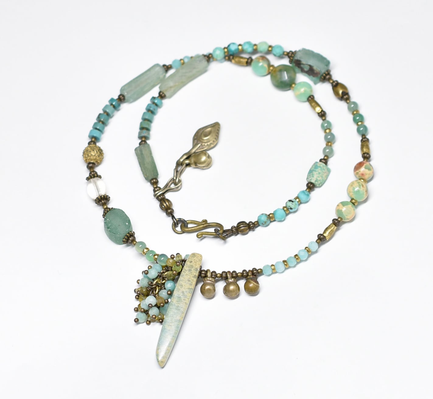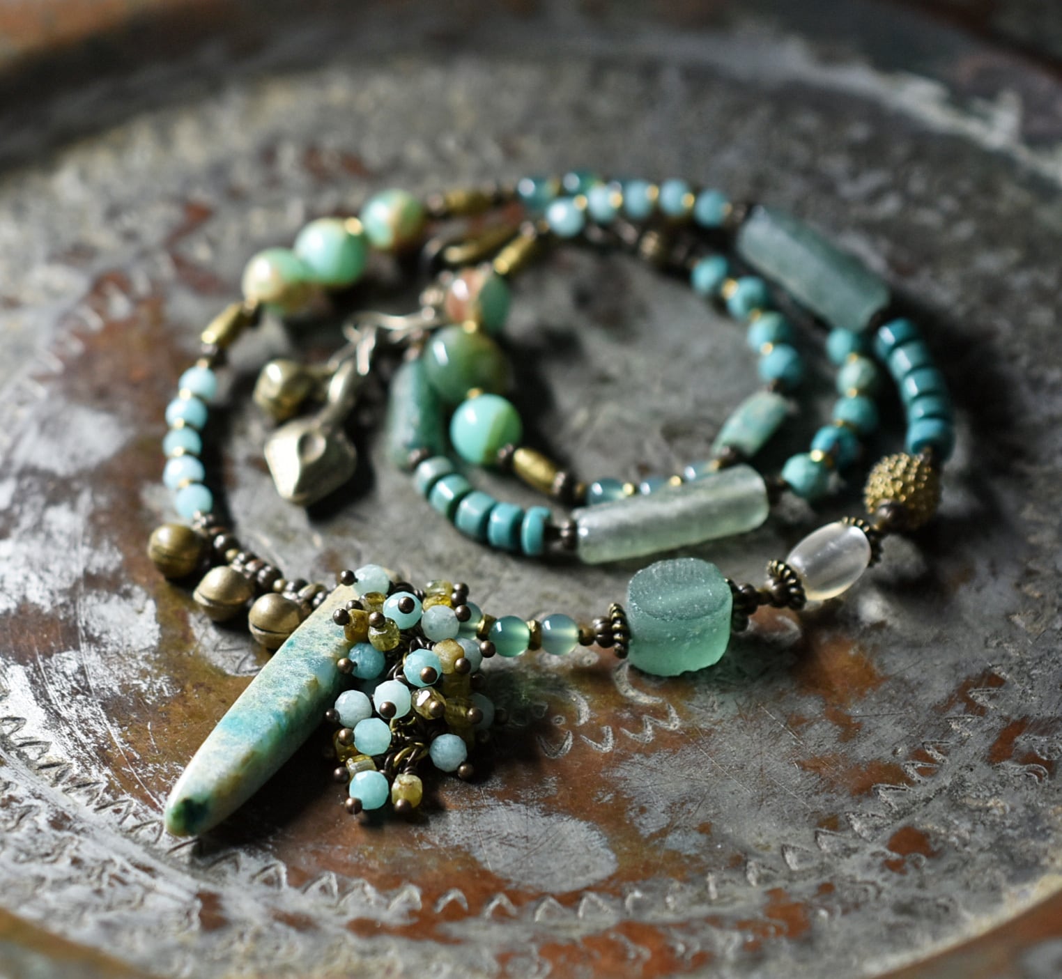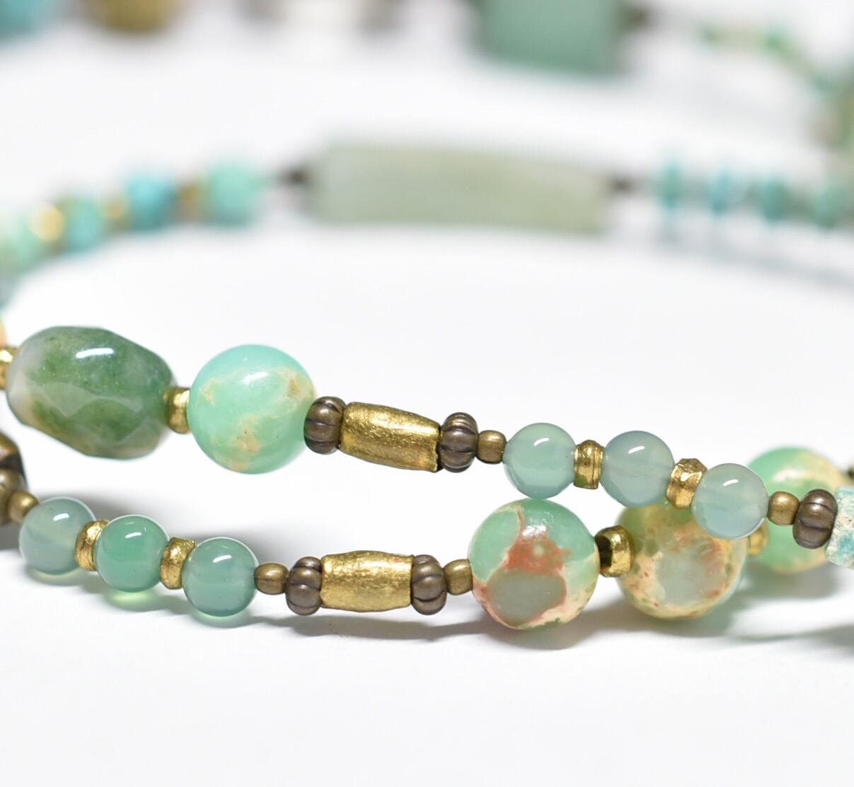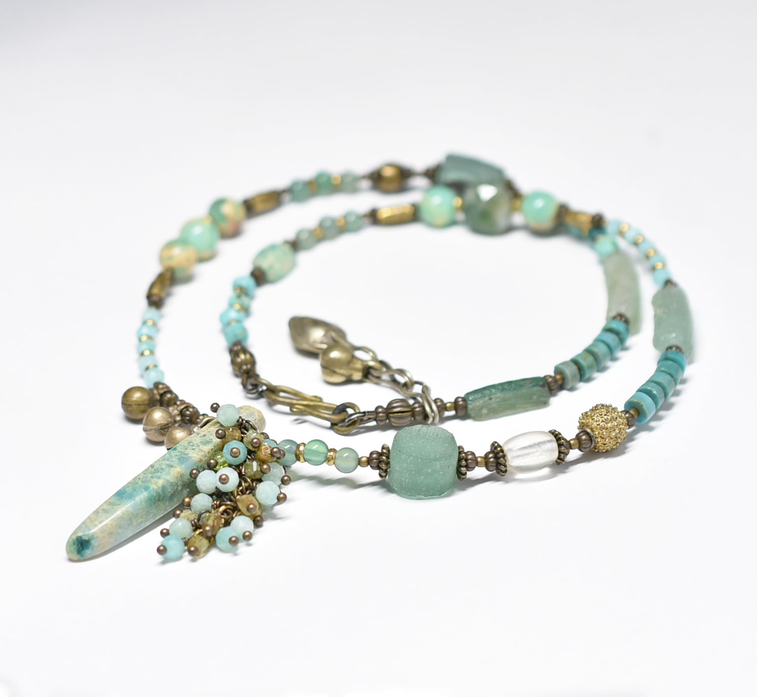 氷柱ジャスパーとたわわなアマゾナイト&トルマリン、民族鈴、ローマングラス、ブラスビーズ、多彩グリーンストーンビーズのネックレス