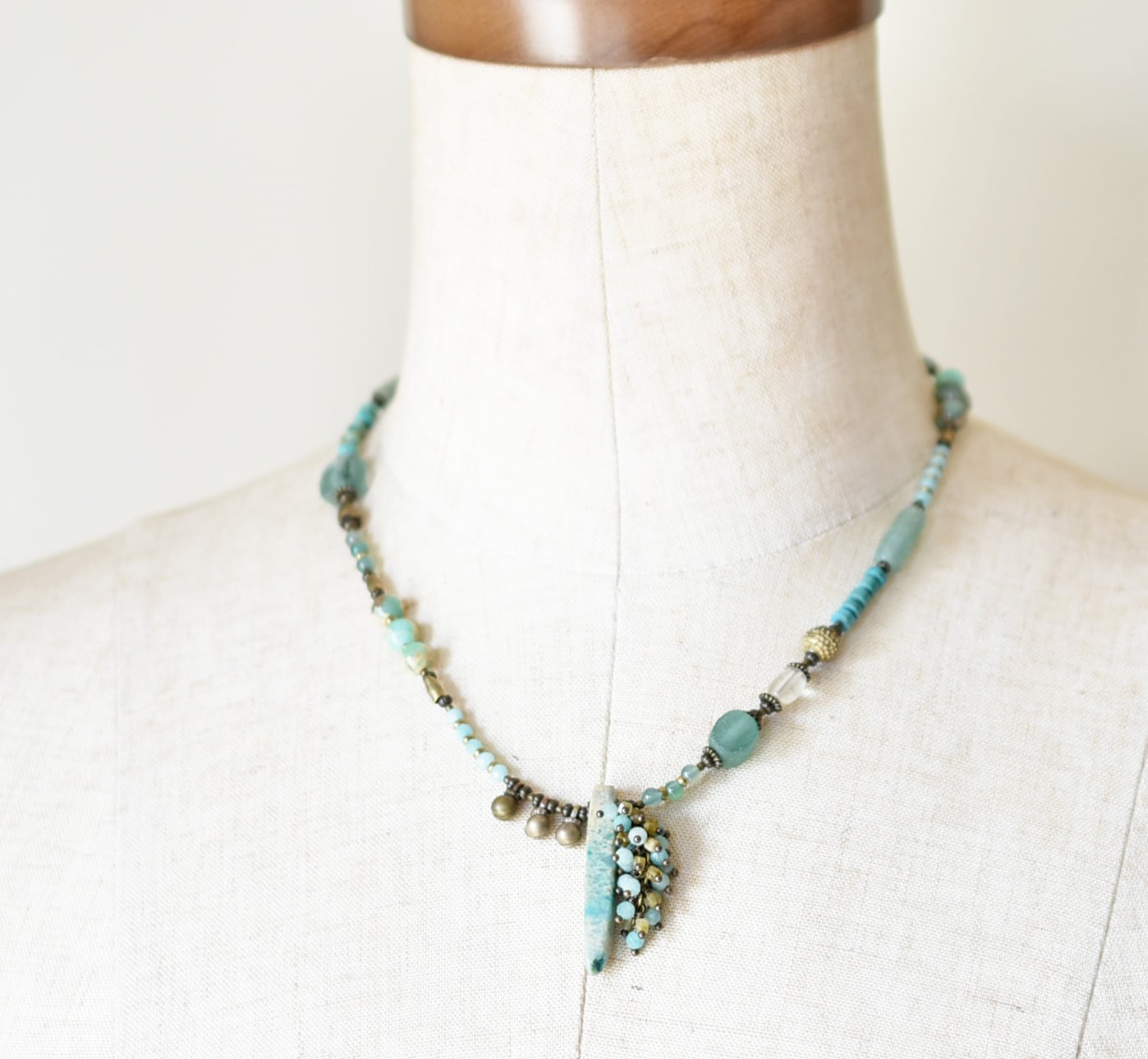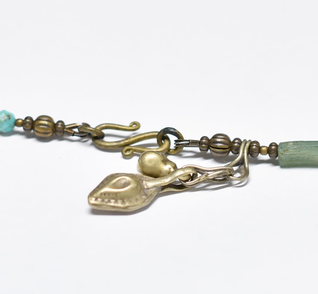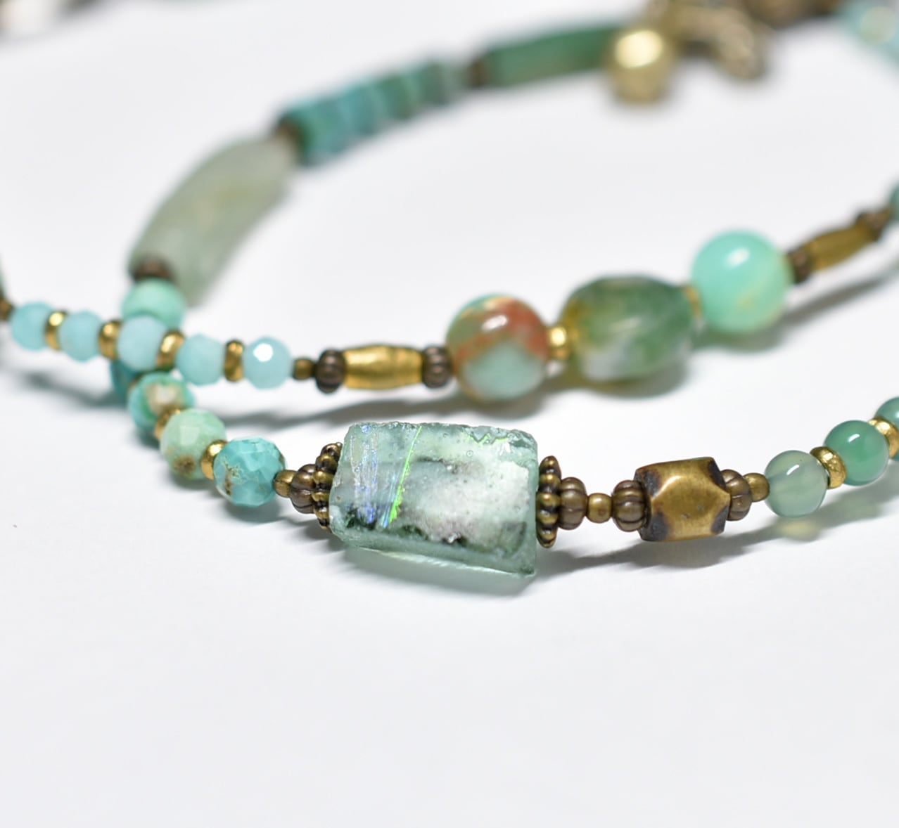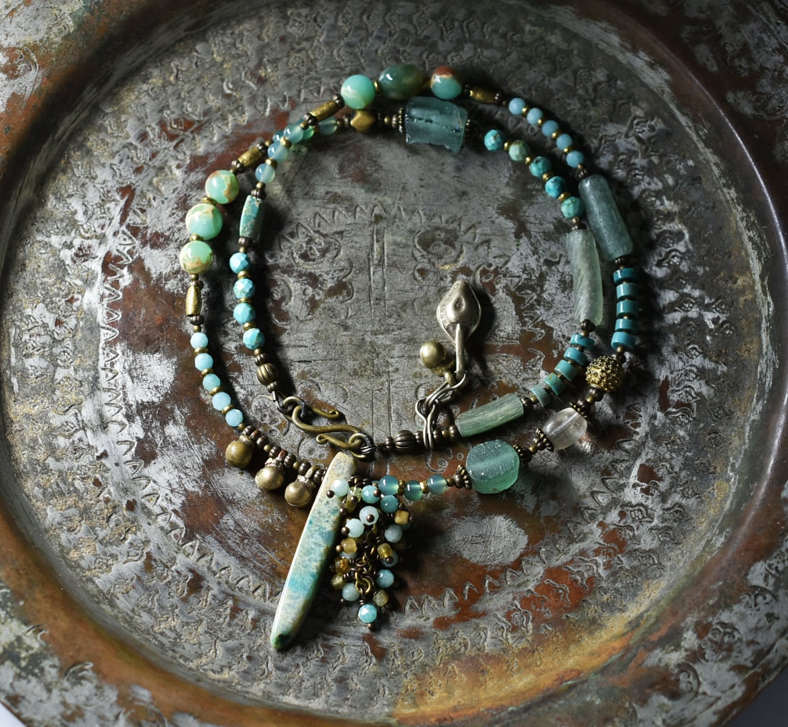 氷柱ジャスパーとたわわなアマゾナイト&トルマリン、民族鈴、ローマングラス、ブラスビーズ、多彩グリーンストーンビーズのネックレス