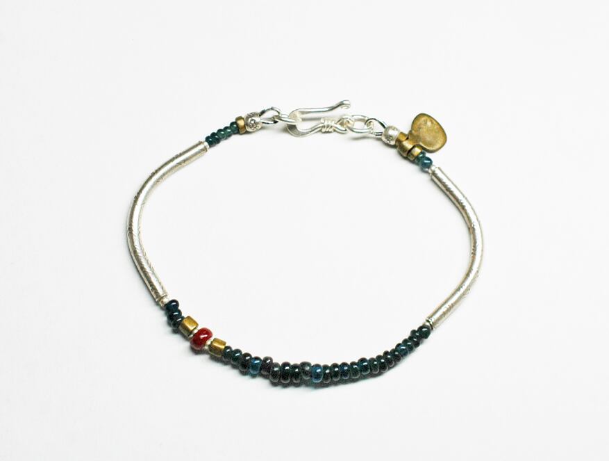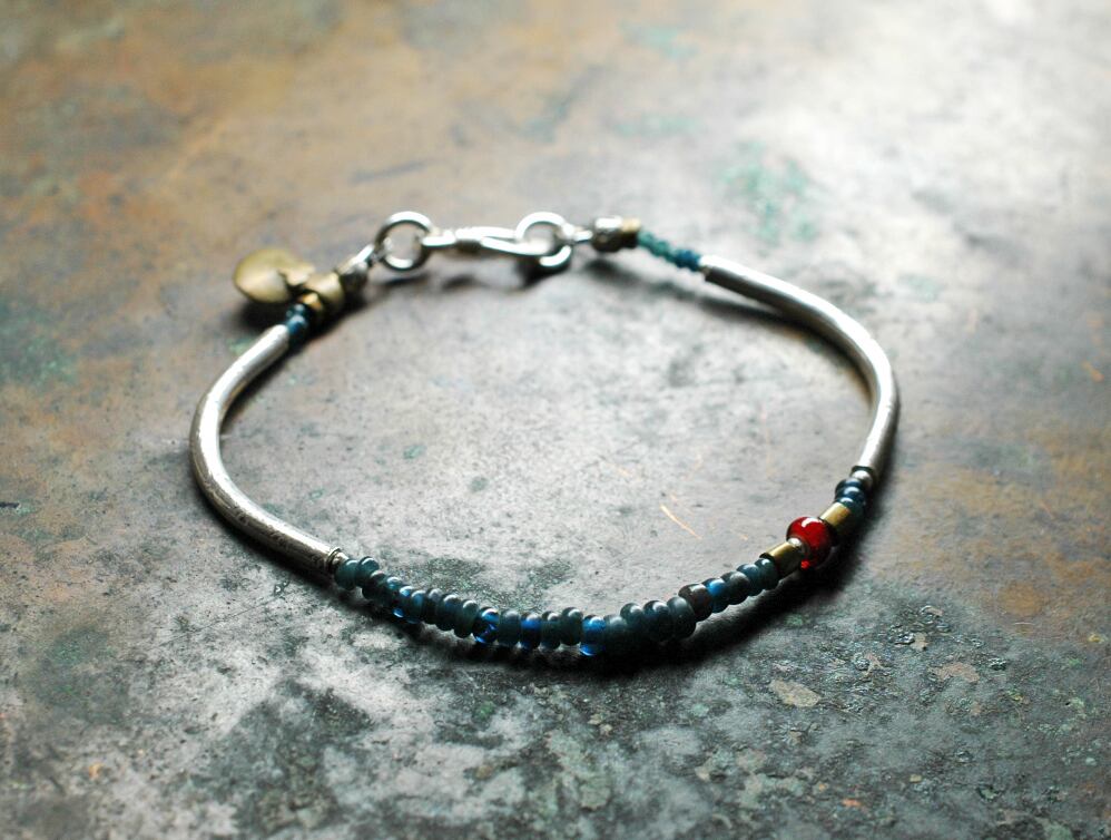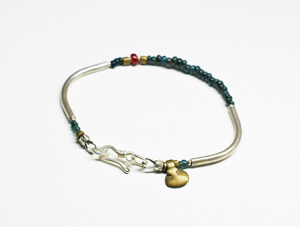 灰青色のアンティークビーズと、くの字のカレンシルバーを繋いだブレスです。
