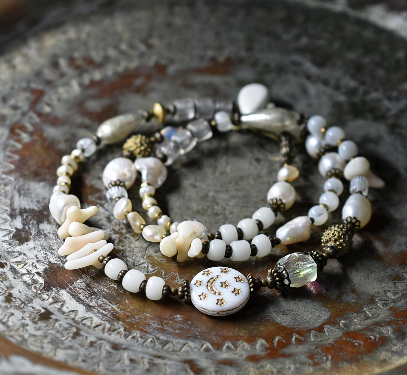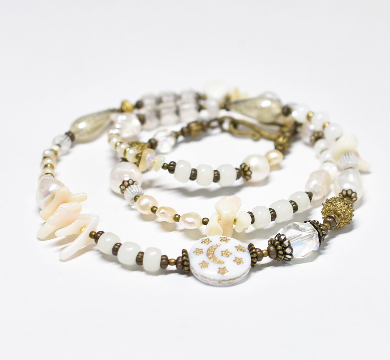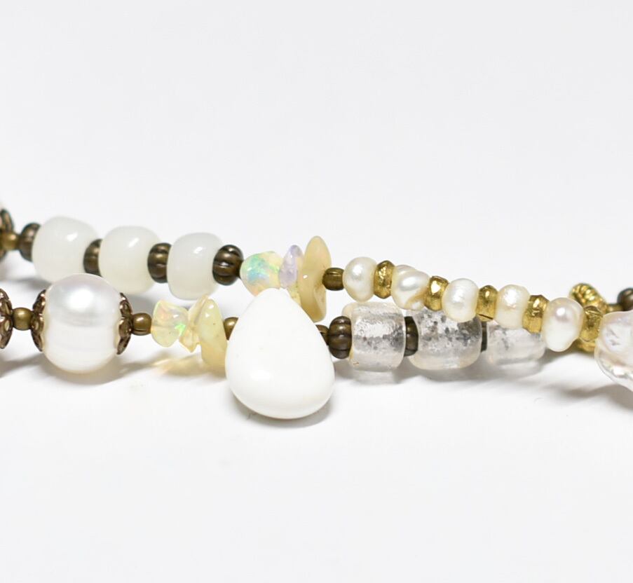 素材:ガラス、真鍮、淡水パール、珊瑚、マザーオブパール、オパール、マグネサイト、ワイヤー