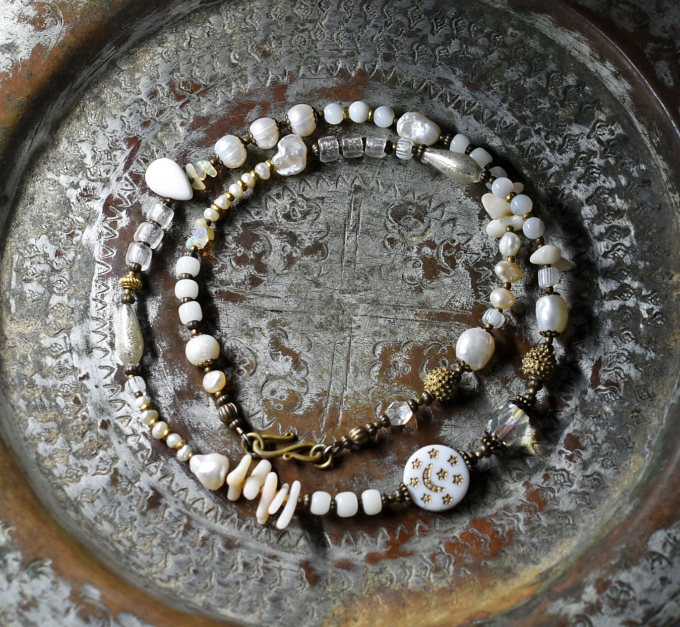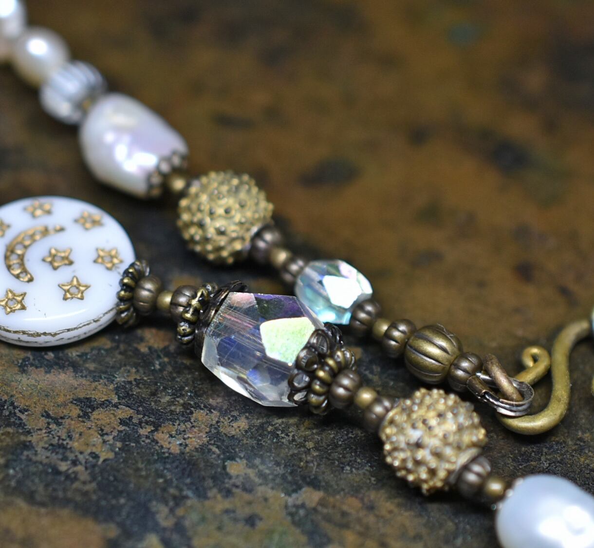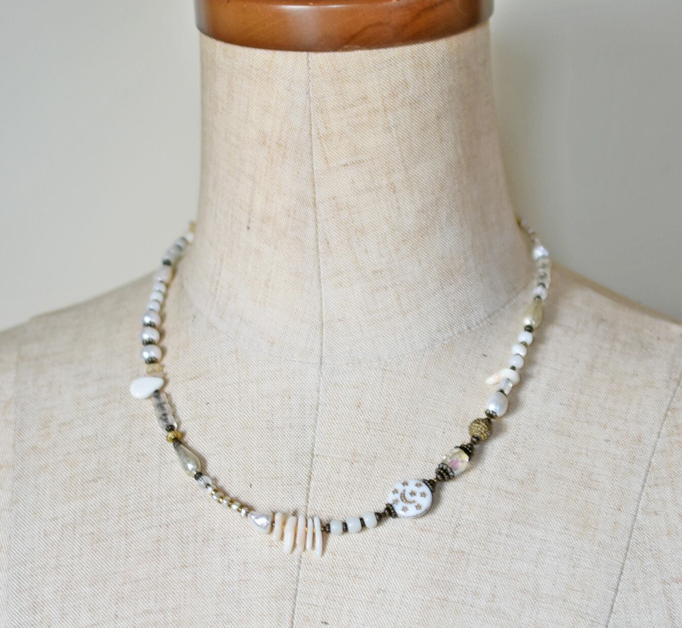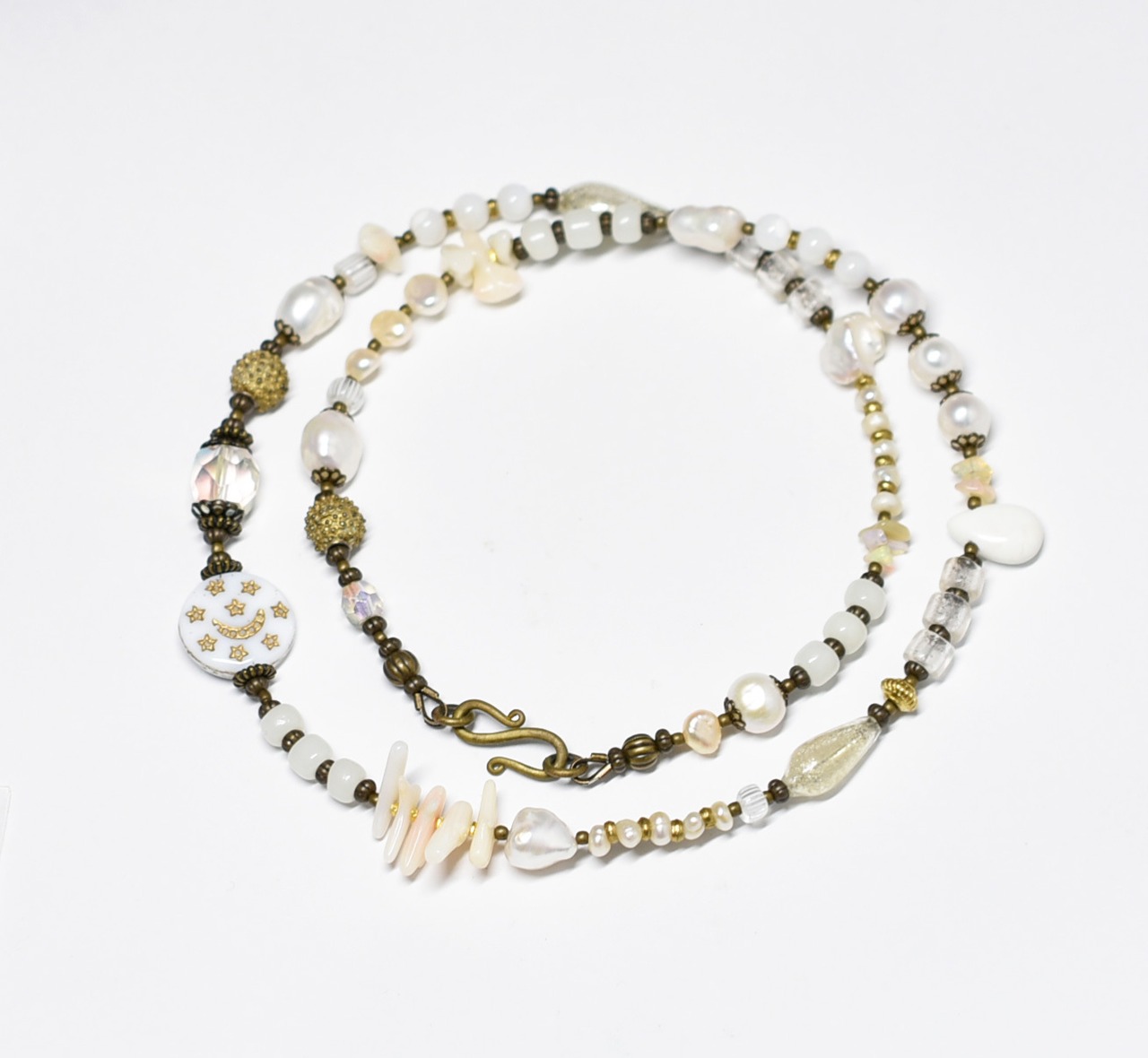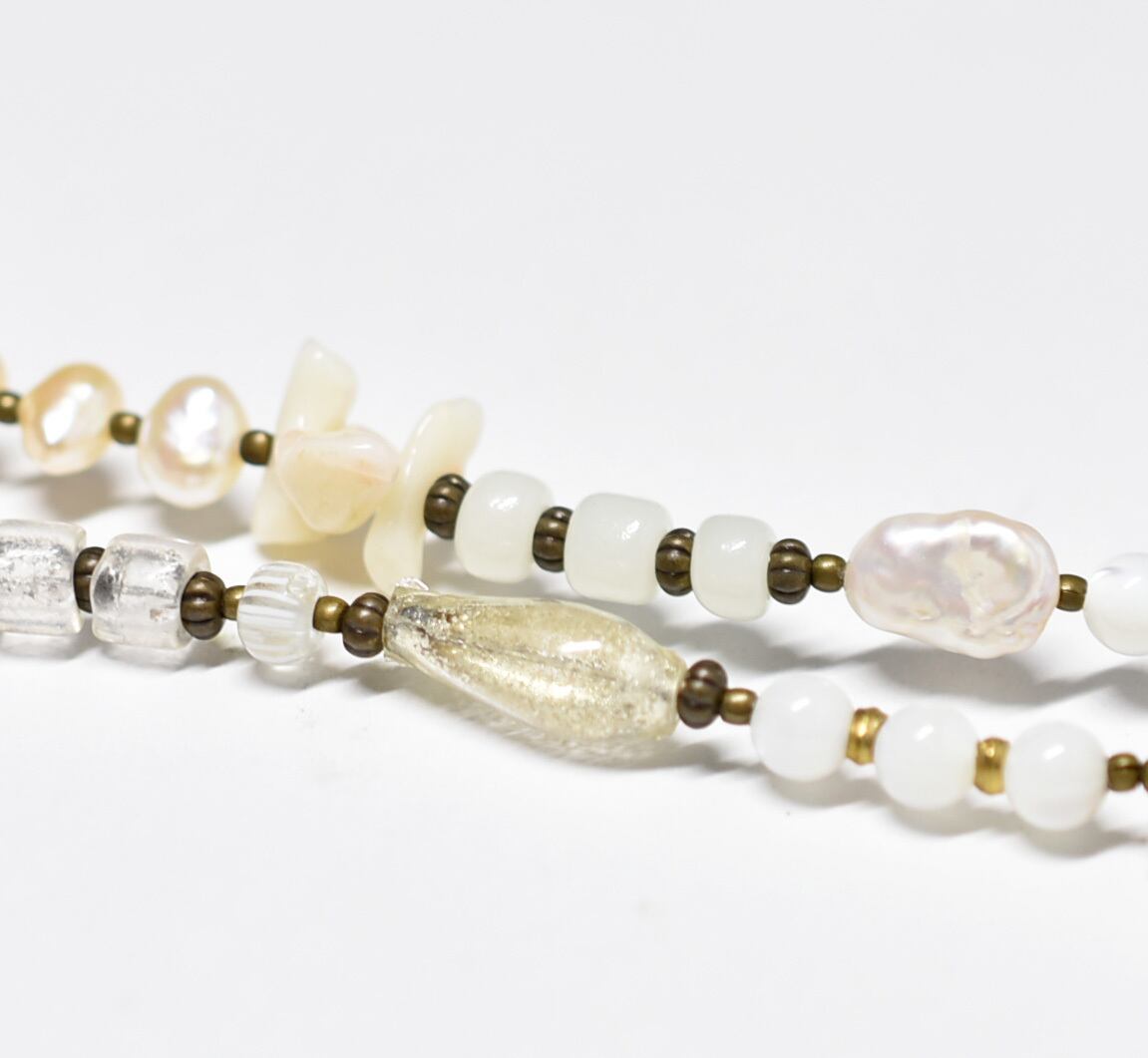 ヴィンテージオーロラビーズ、聖者のビーズ、つぶつぶブラス、淡水パール、多彩ホワイトビーズのネックレス