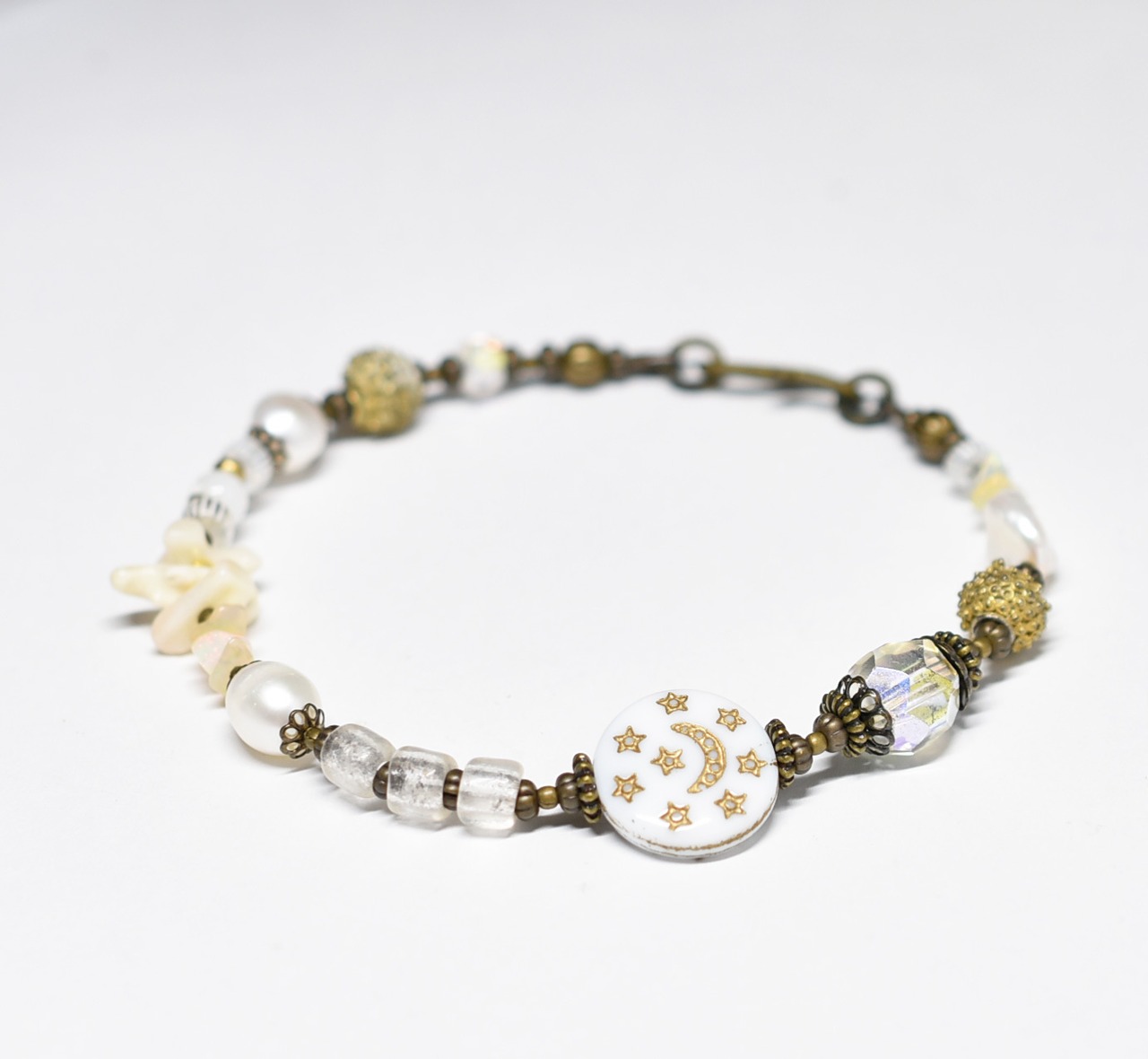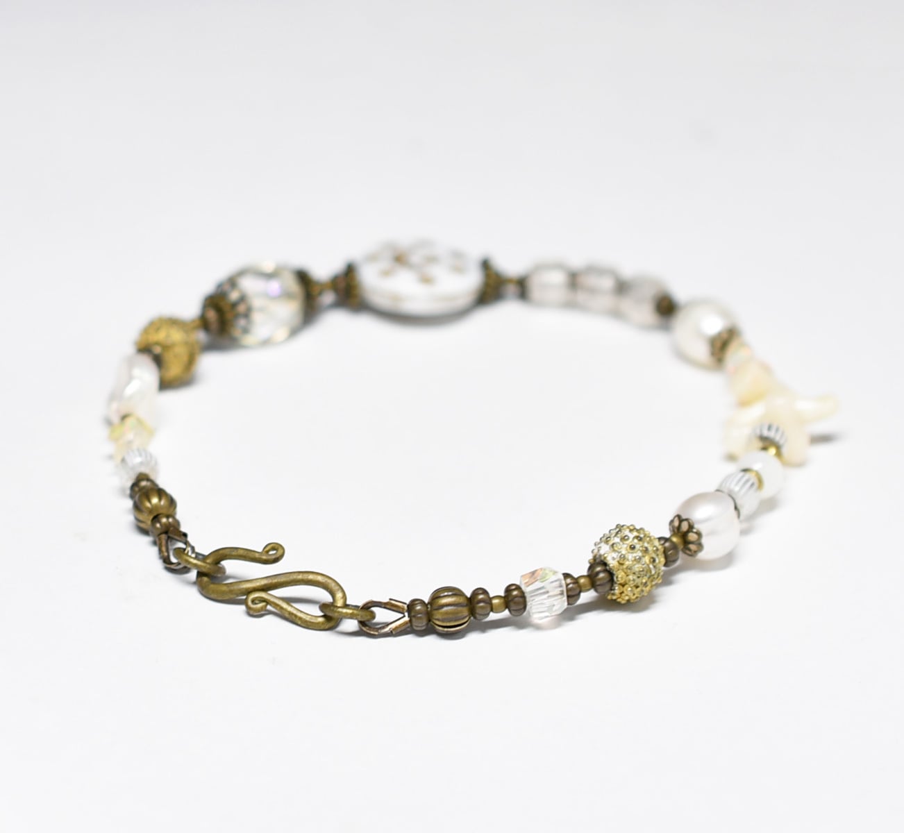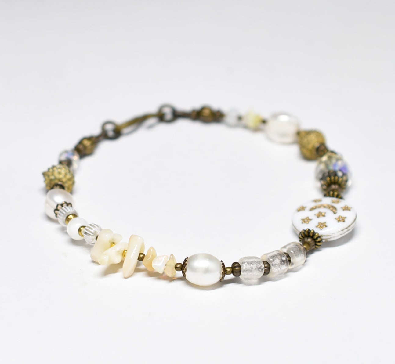 ヴィンテージオーロラビーズ、聖者のビーズ、つぶつぶブラス、淡水パール、多彩ホワイトビーズを繋いだブレスです。