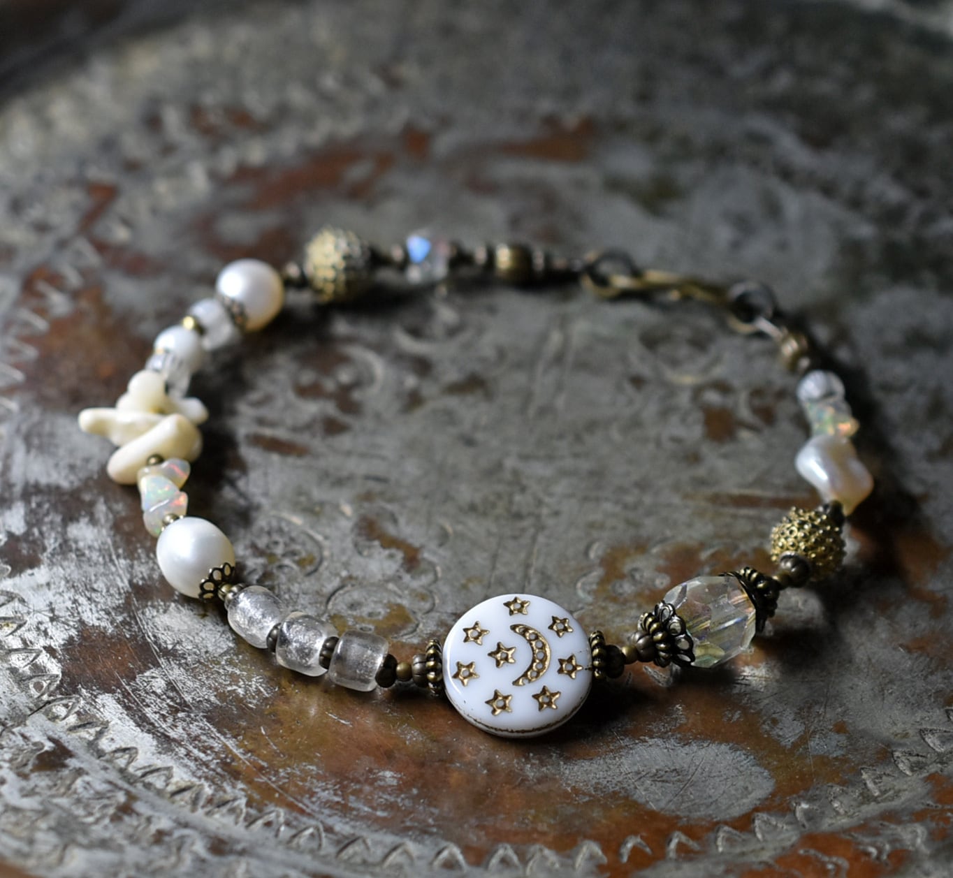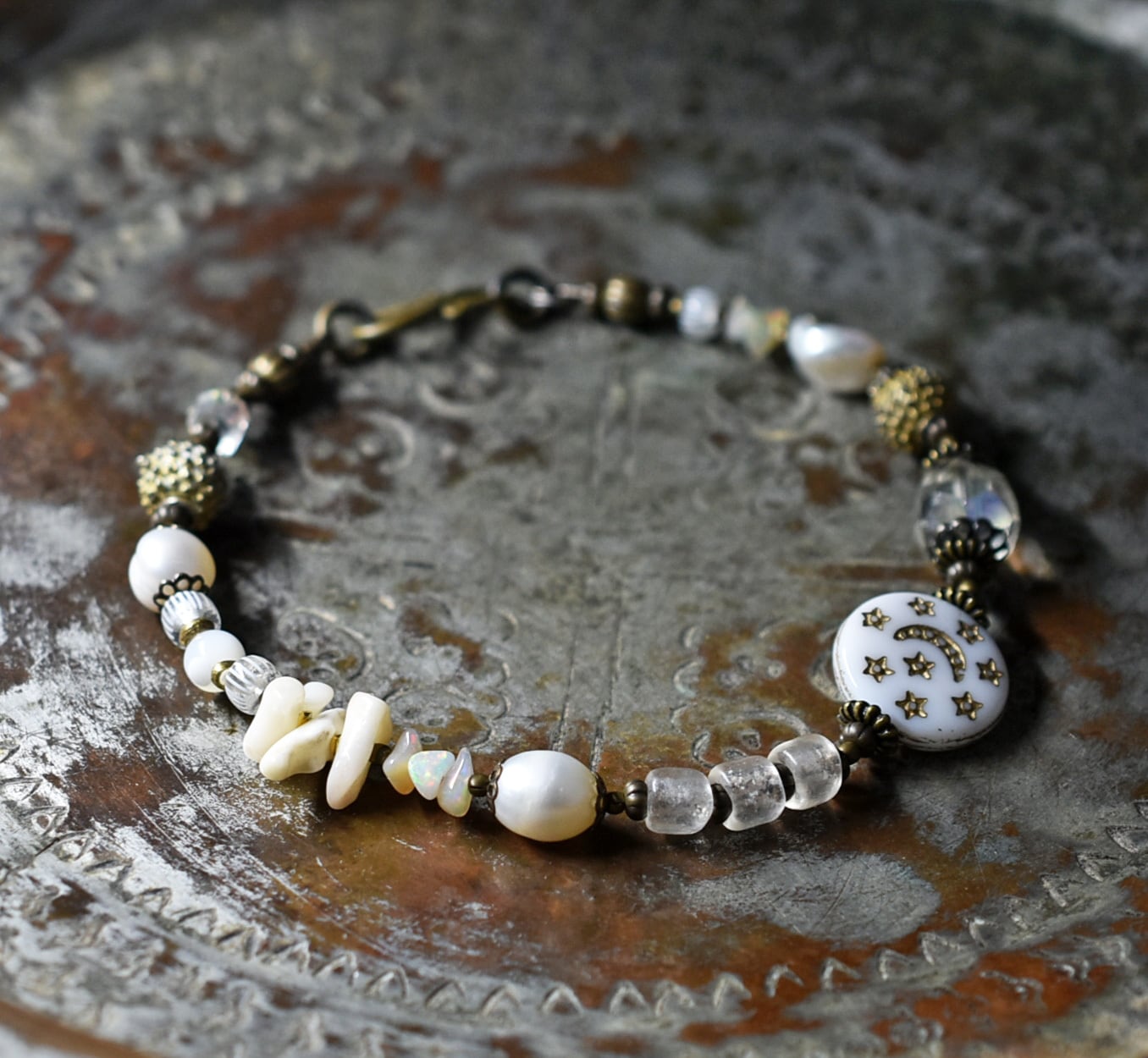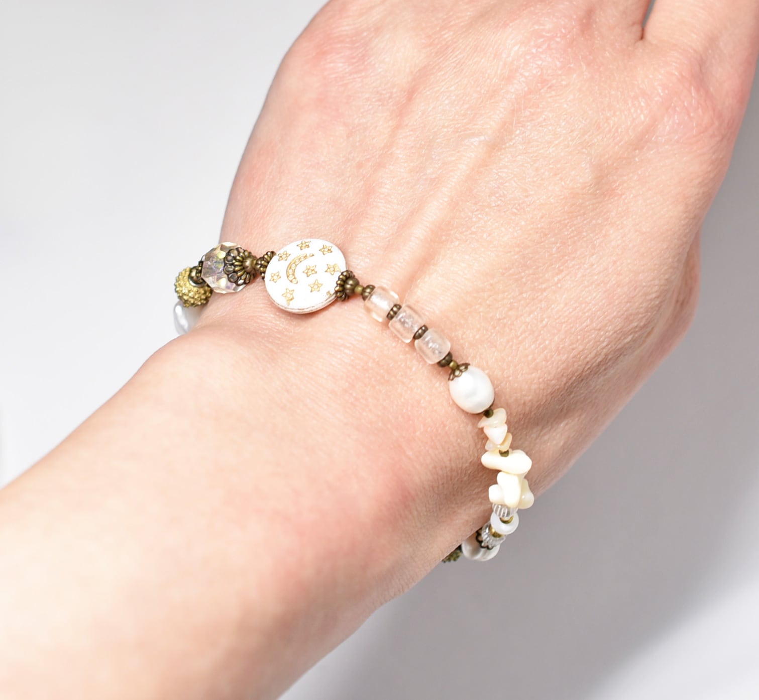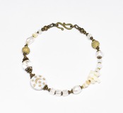ヴィンテージオーロラビーズ、聖者のビーズ、つぶつぶブラス、淡水パール、多彩ホワイトビーズを繋いだブレスです。