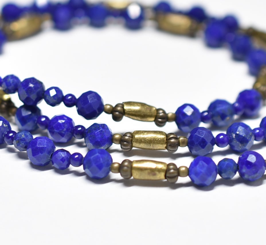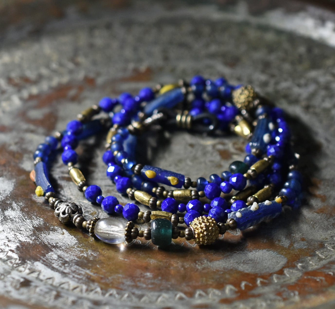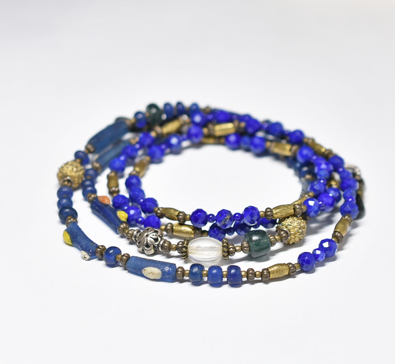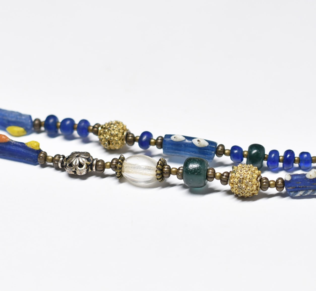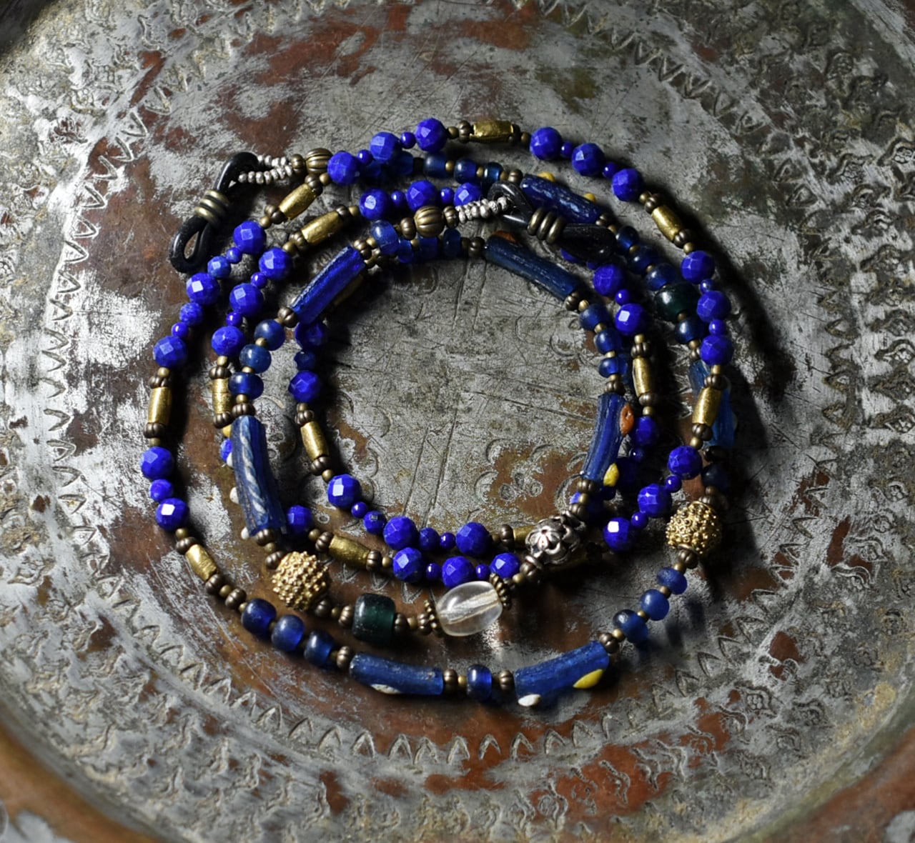ローマングラス、ブルービーズ、ボヘミアビーズ、つぶつぶブウラス、インドシルバー、ラピス&アフリカンブラスのグラスコード