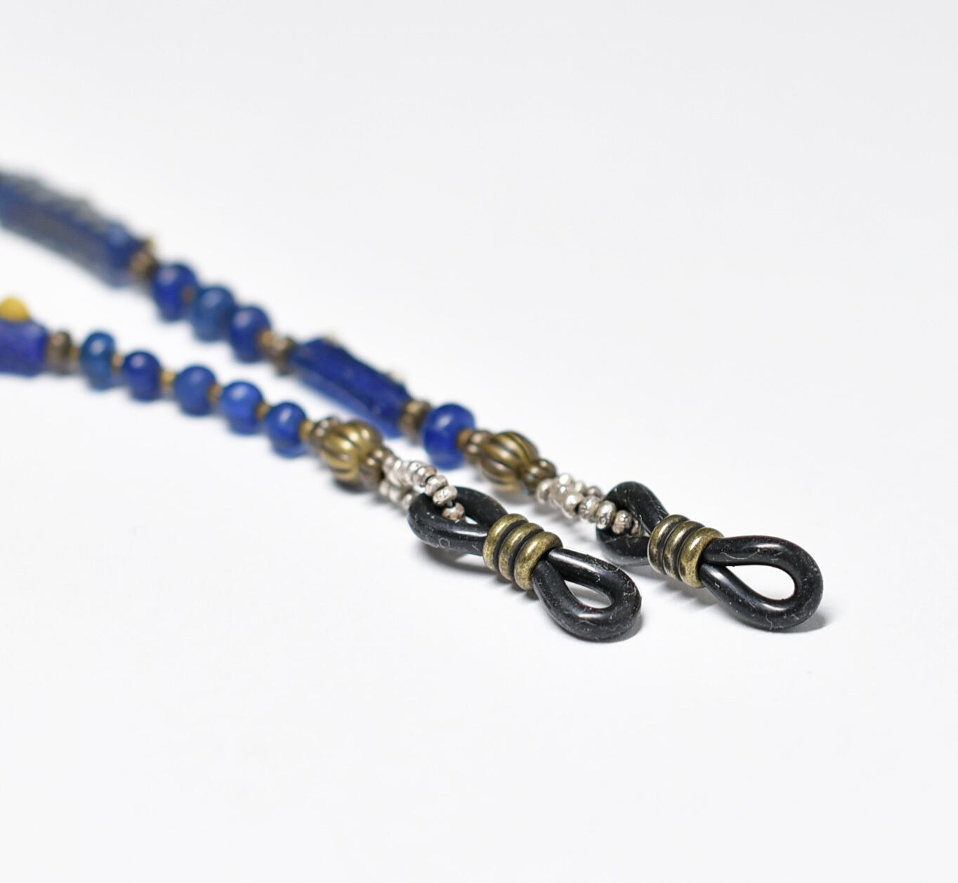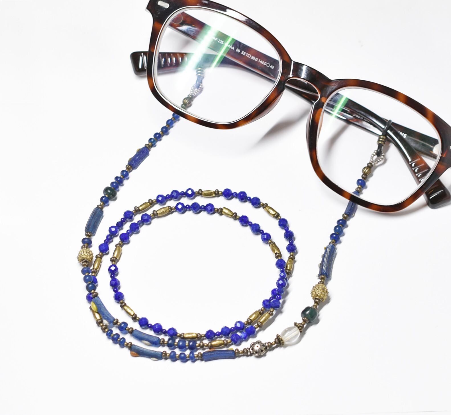 ローマングラス、ブルービーズ、ボヘミアビーズ、つぶつぶブウラス、インドシルバー、ラピス&アフリカンブラスなどを繋いだグラスコード(眼鏡チェーン)です。