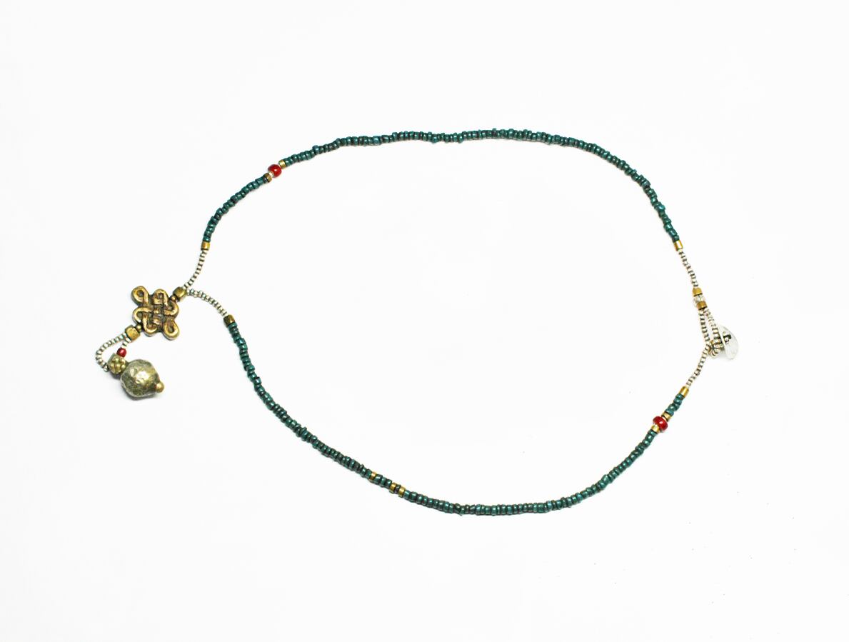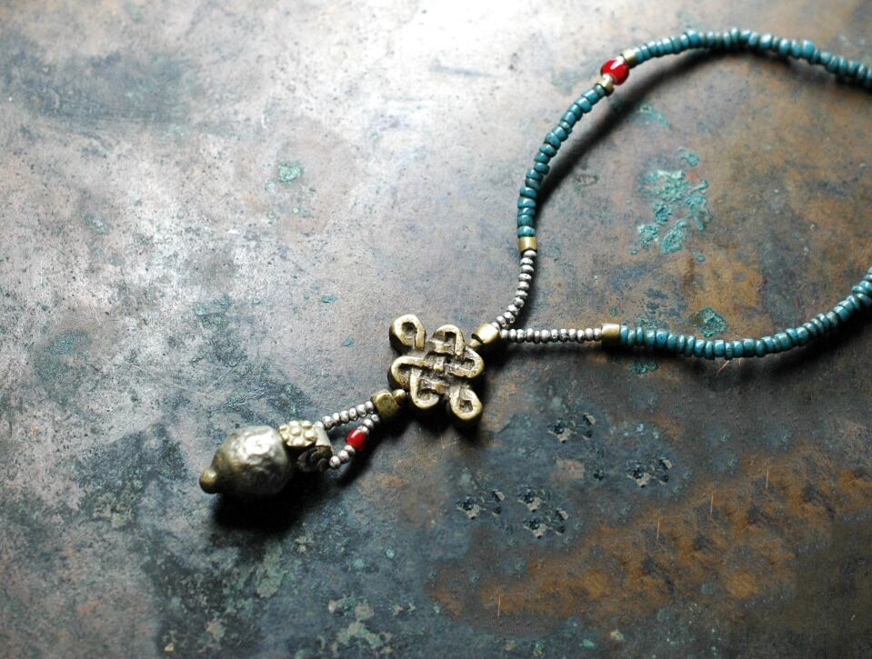 エンドレスノットと青碧色のアンティークビーズのネックレス
