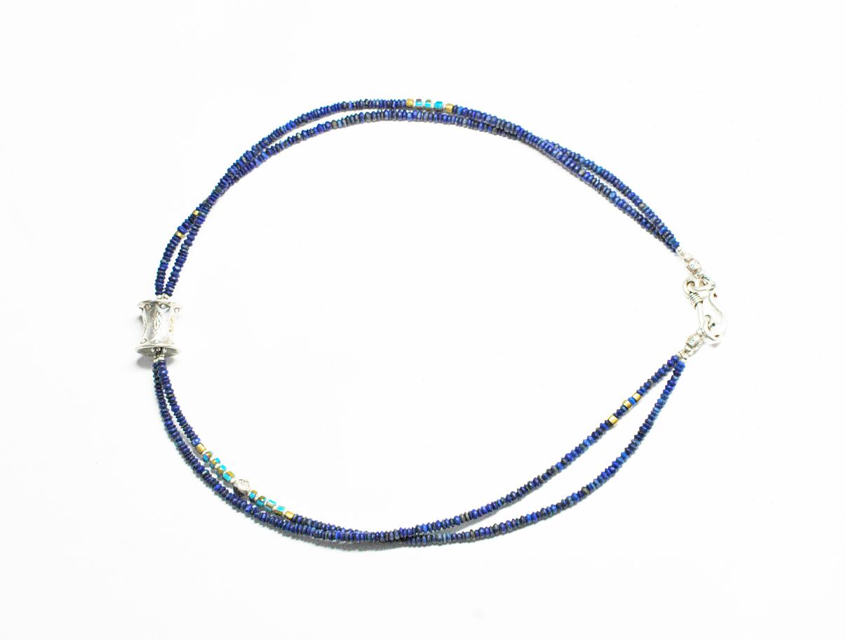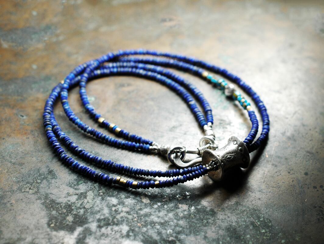 カレンシルバーのトップを算盤型の小さなラピスラズリと、ターコイズブルーのホワイトハーツを繋いだアンシメトリーなネックレスです。