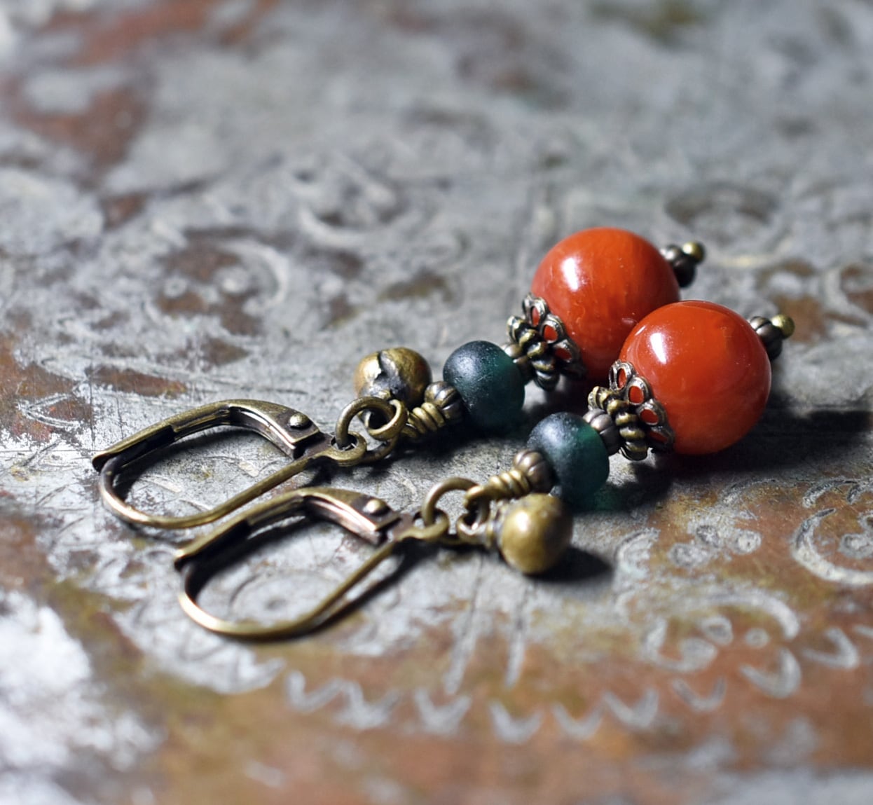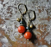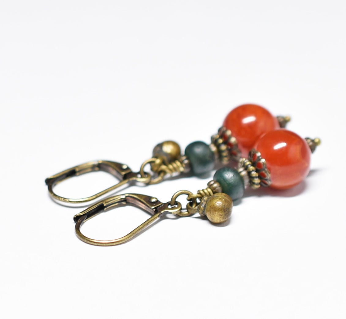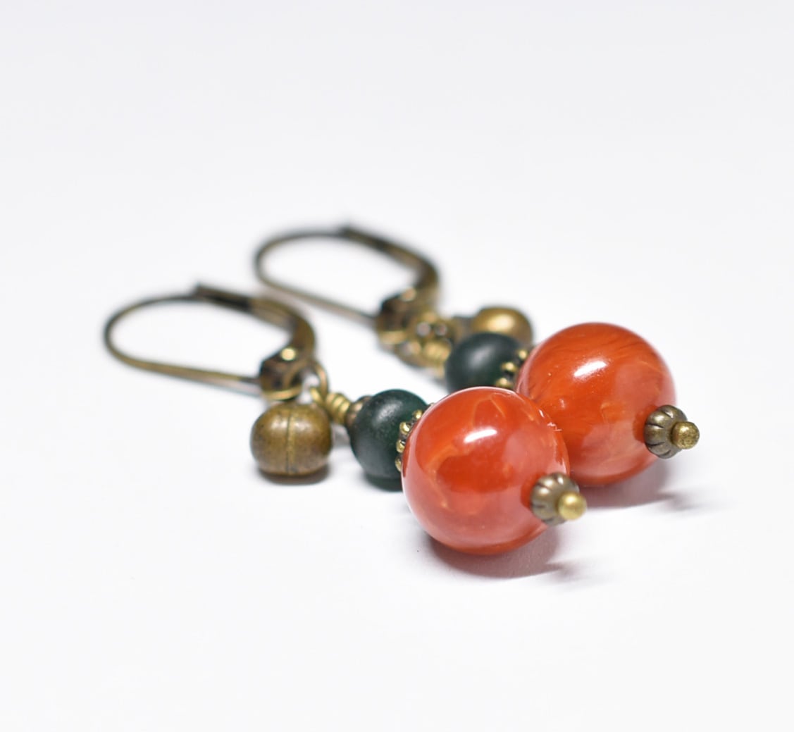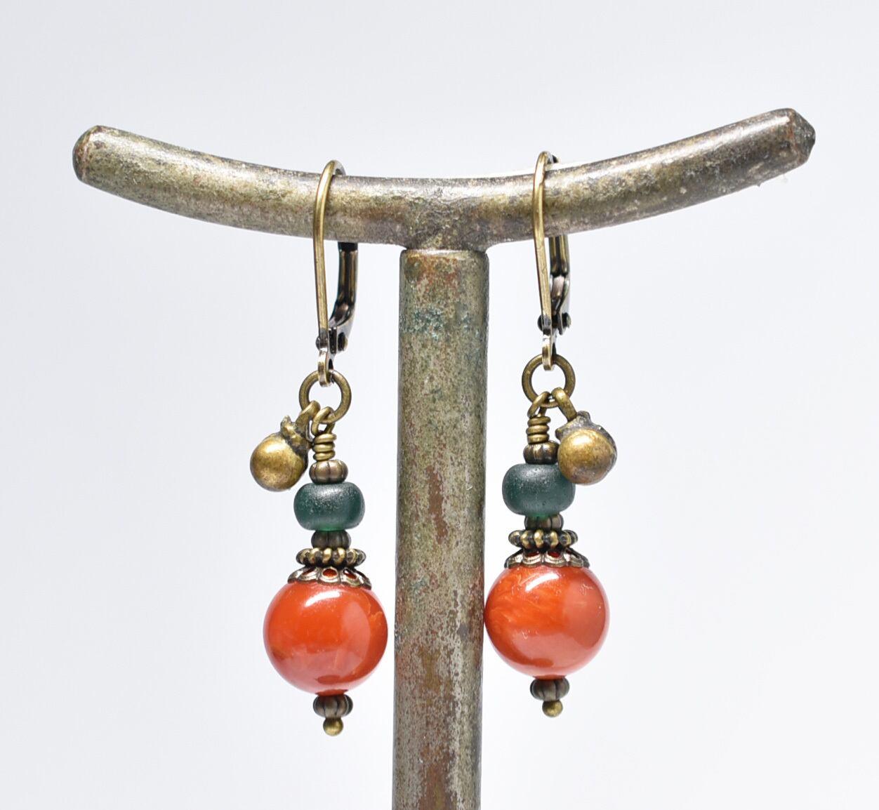 珊瑚色まん丸アフリカンアンバーとグリーンブルービーズ、民族鈴を繋いだピアスです。