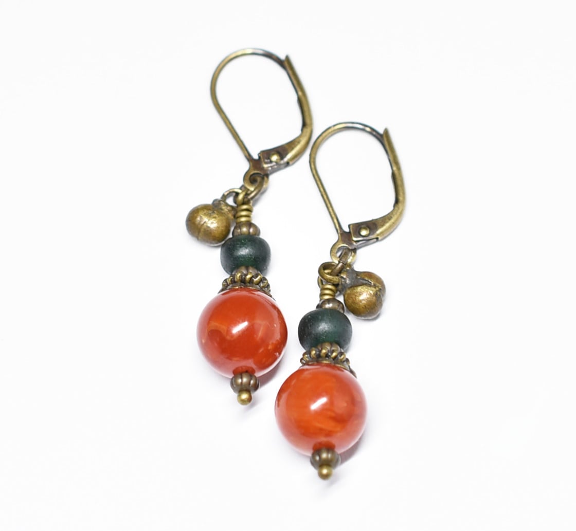 珊瑚色まん丸アフリカンアンバーとグリーンブルービーズ、民族鈴のピアス