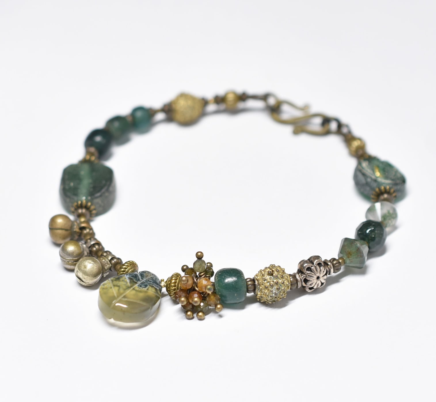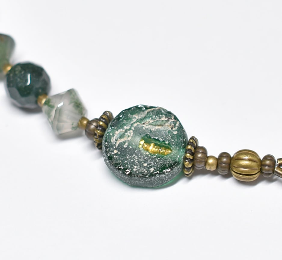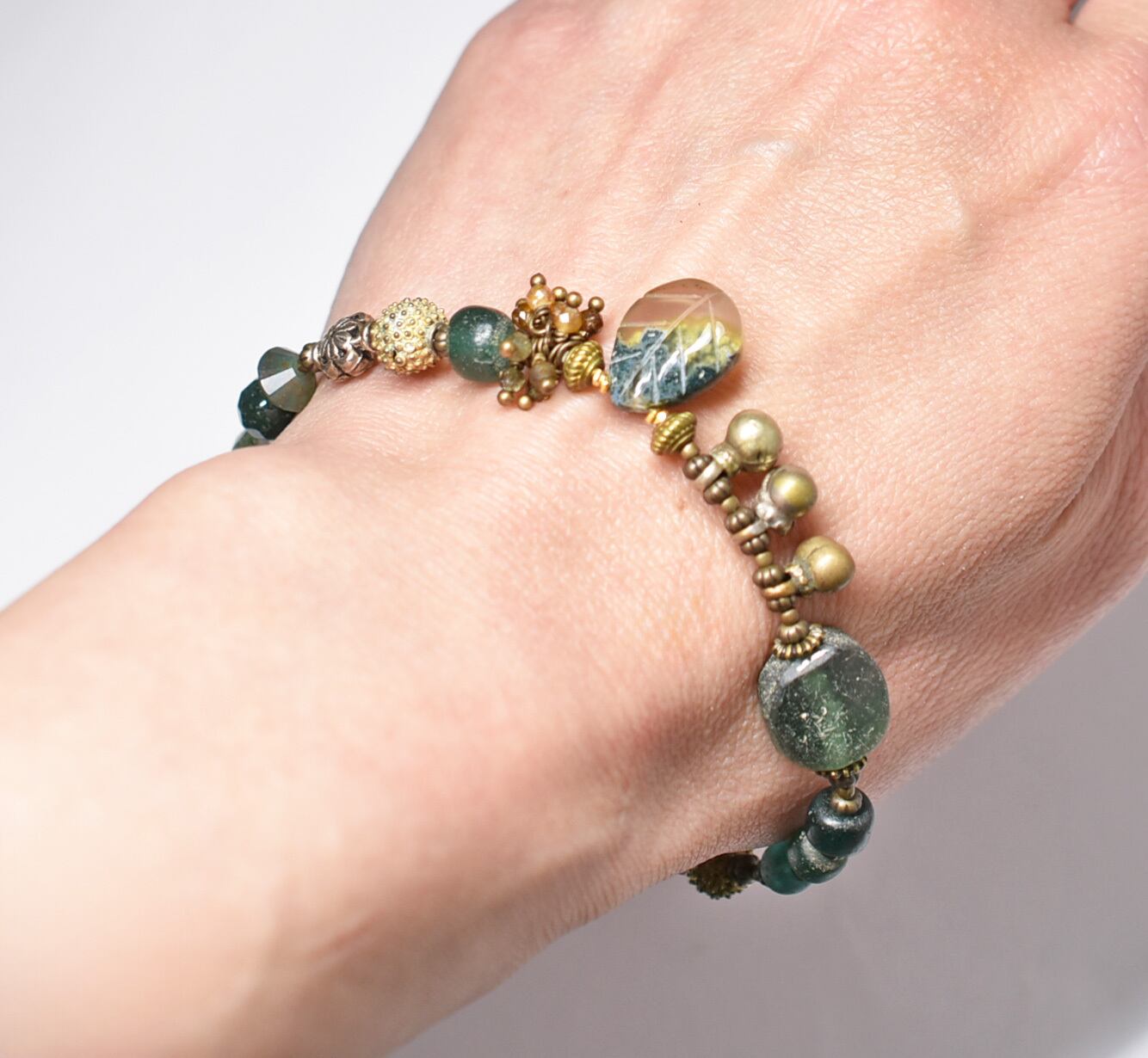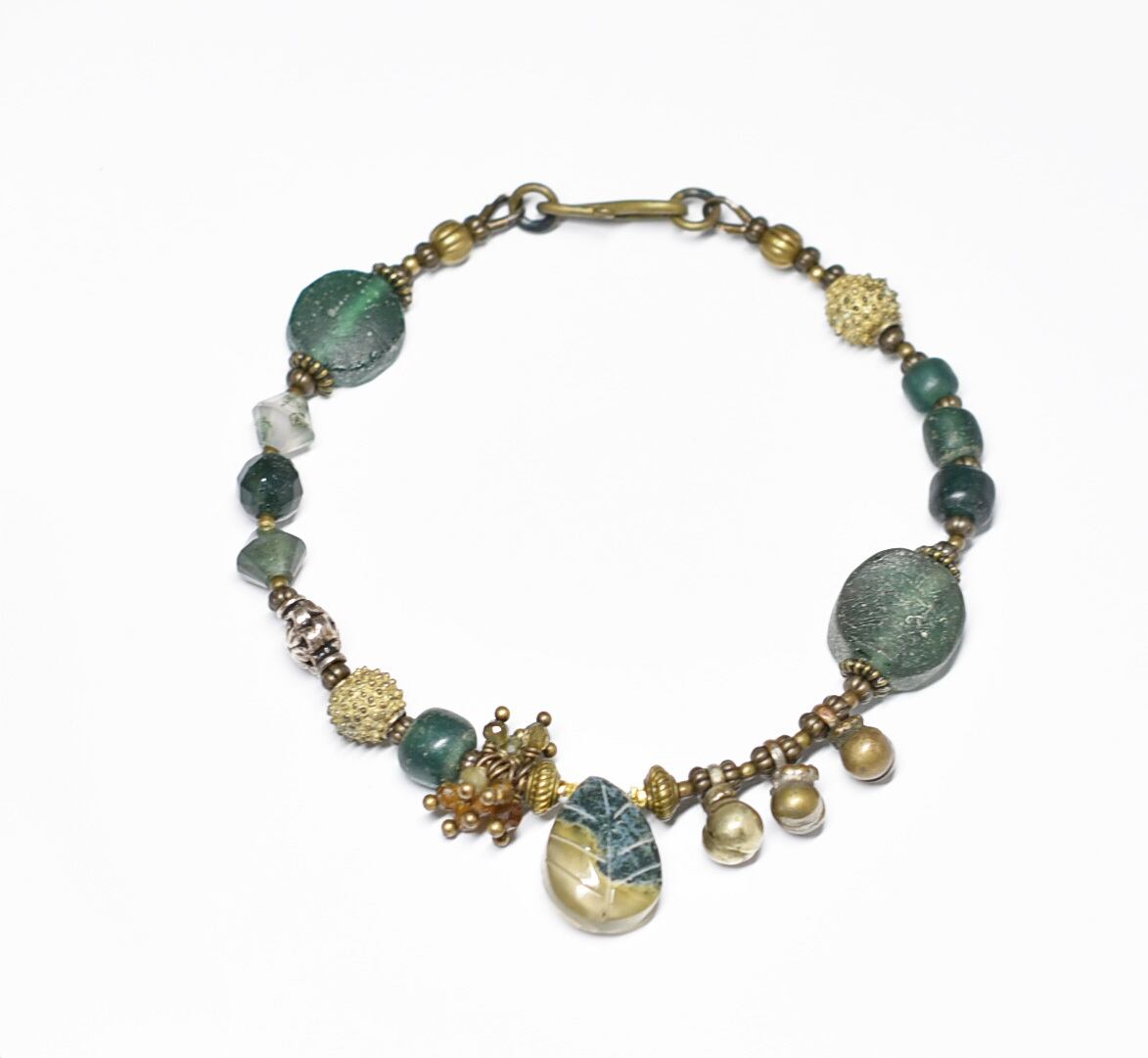 モスアゲートと丸形ローマングラス、トルマリン、ブラスビーズ、インドシルバー、グリーンブルービーズ民族鈴のブレス
