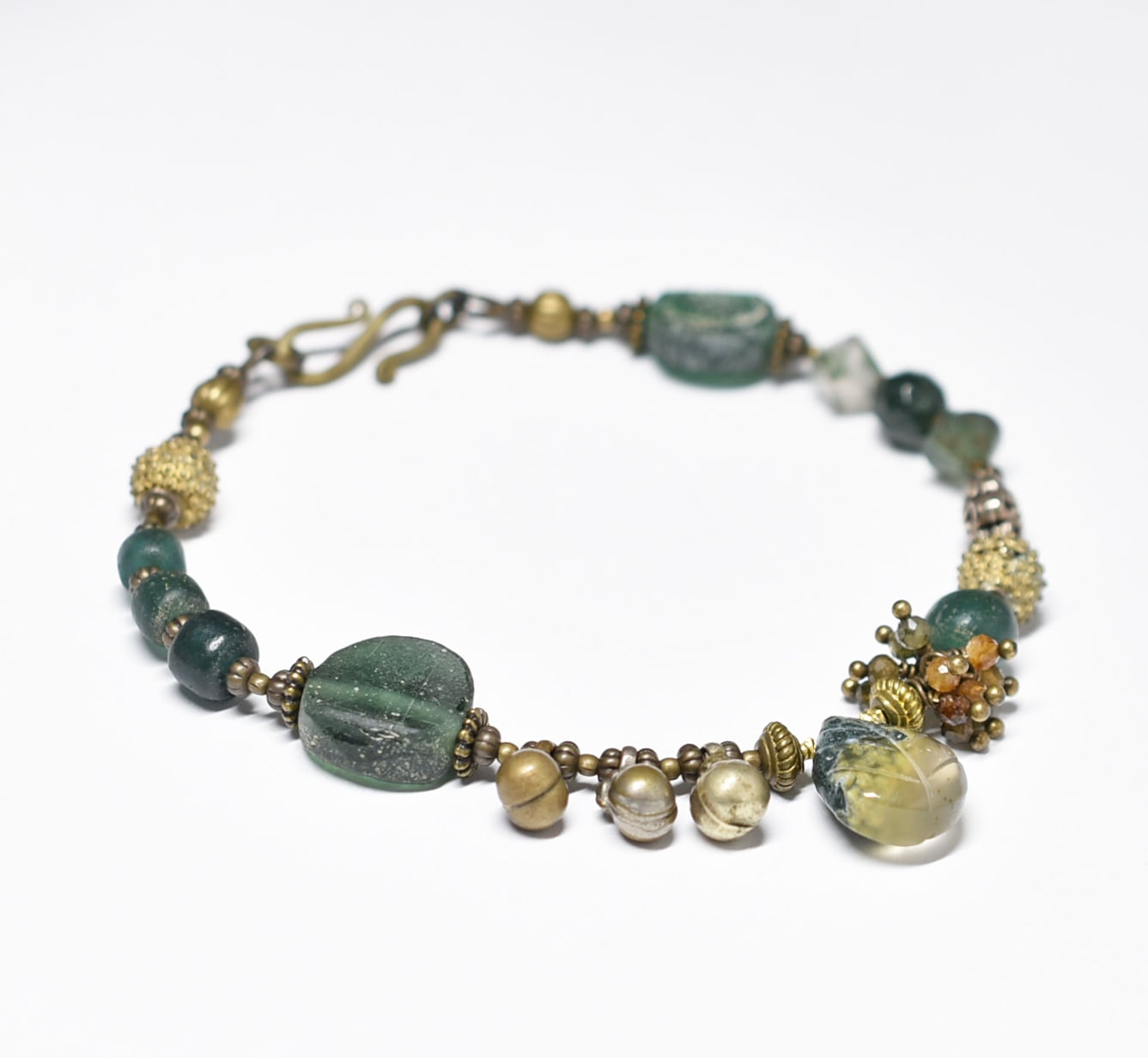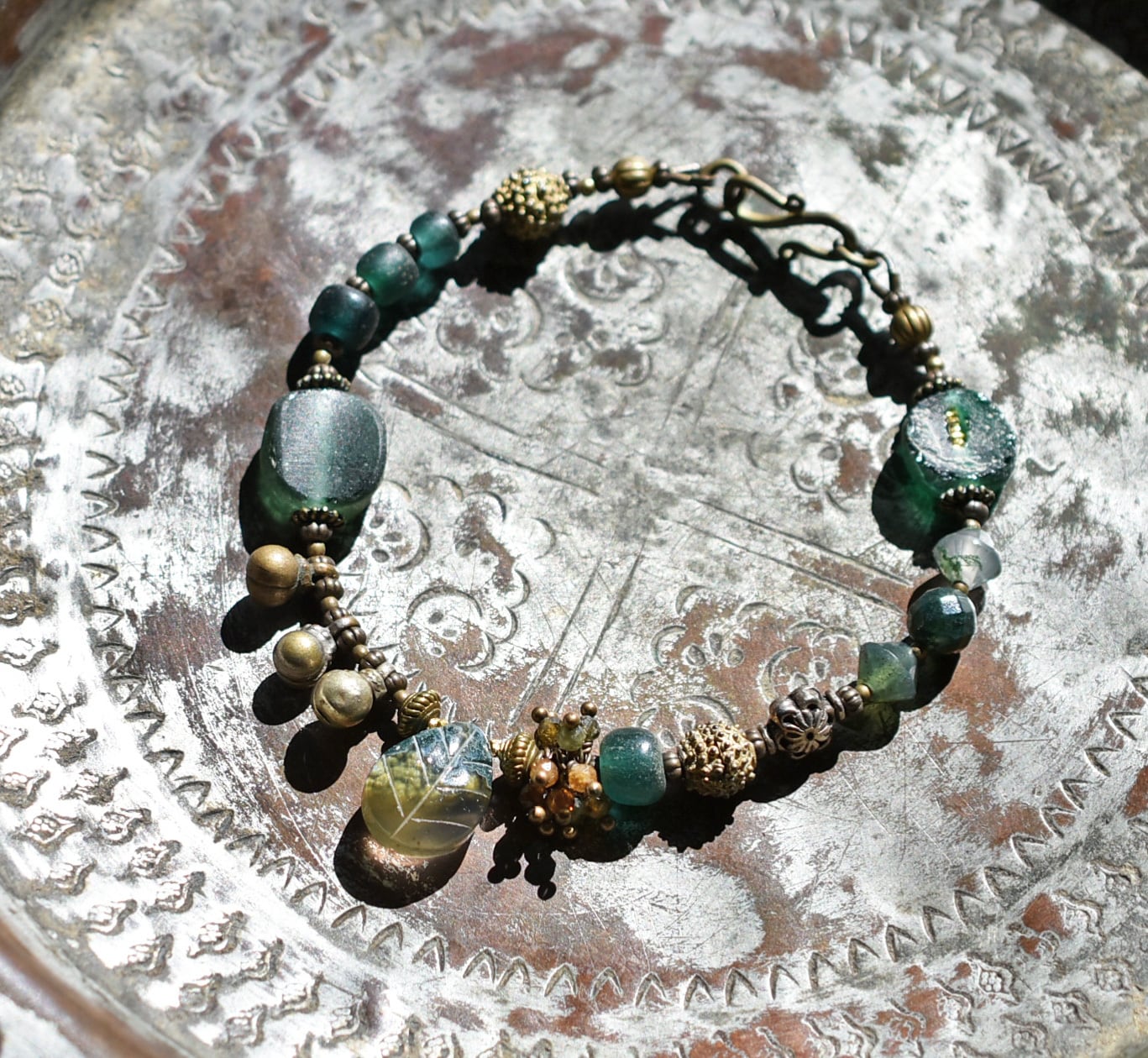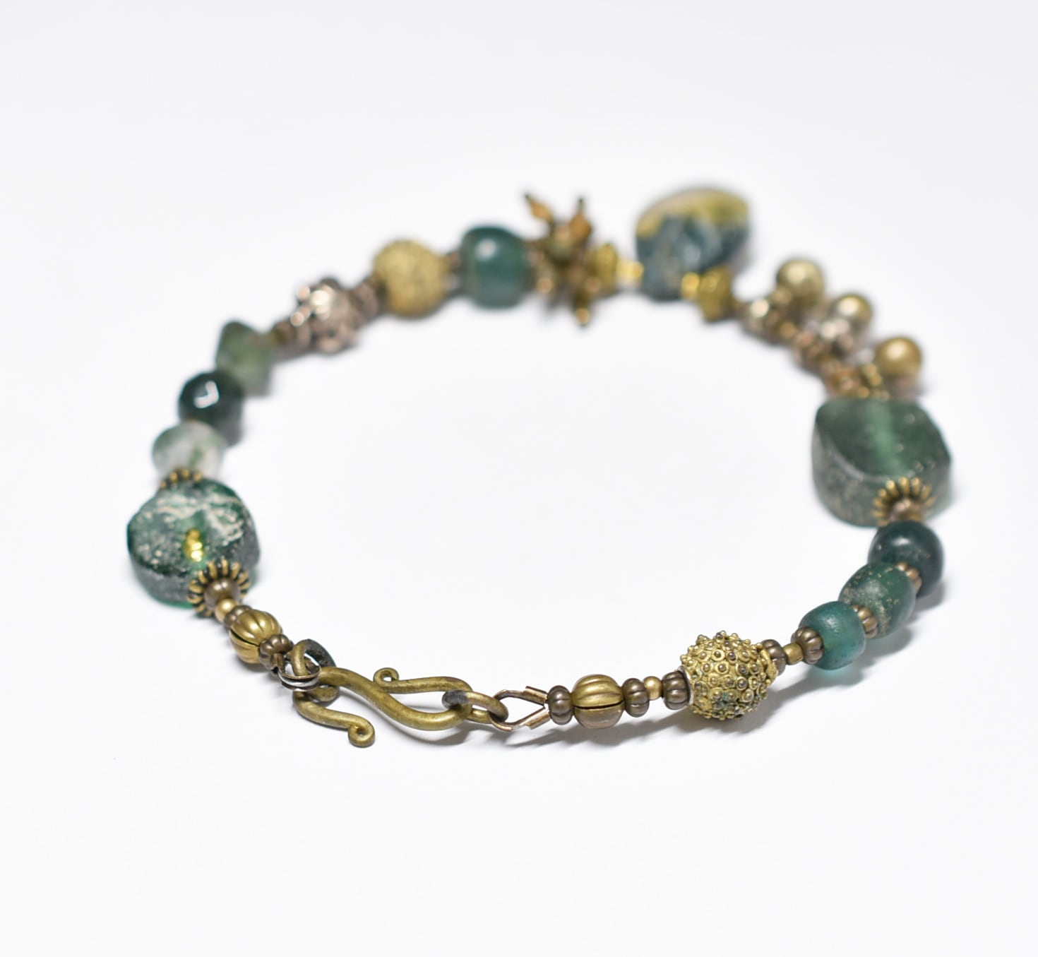 モスアゲートと丸形ローマングラス、トルマリン、ブラスビーズ、インドシルバー、グリーンブルービーズ民族鈴のブレス