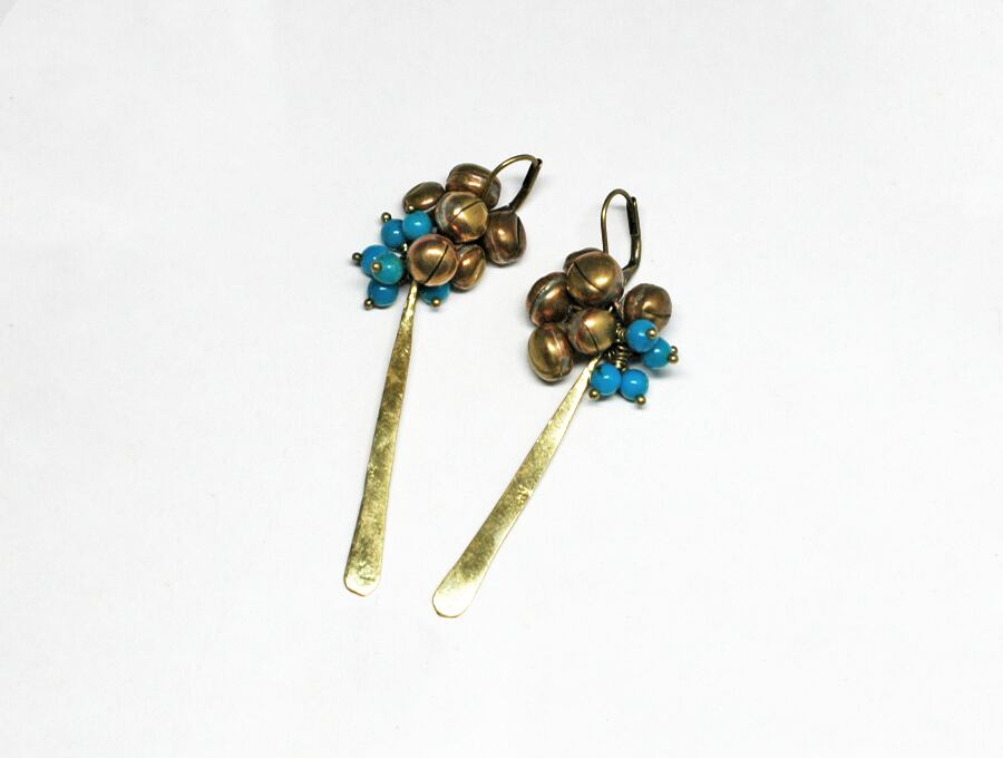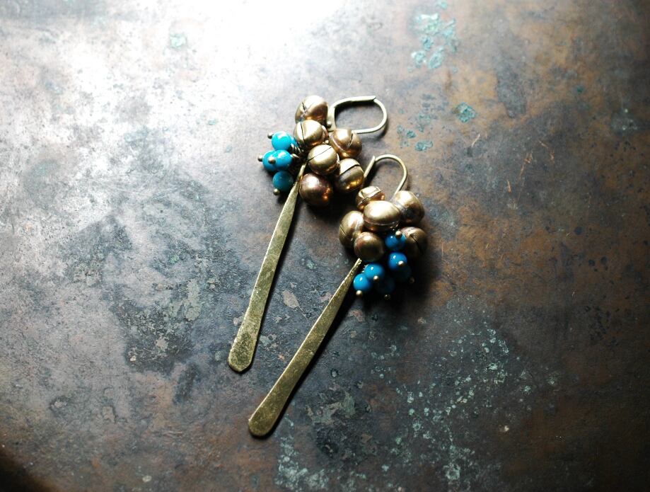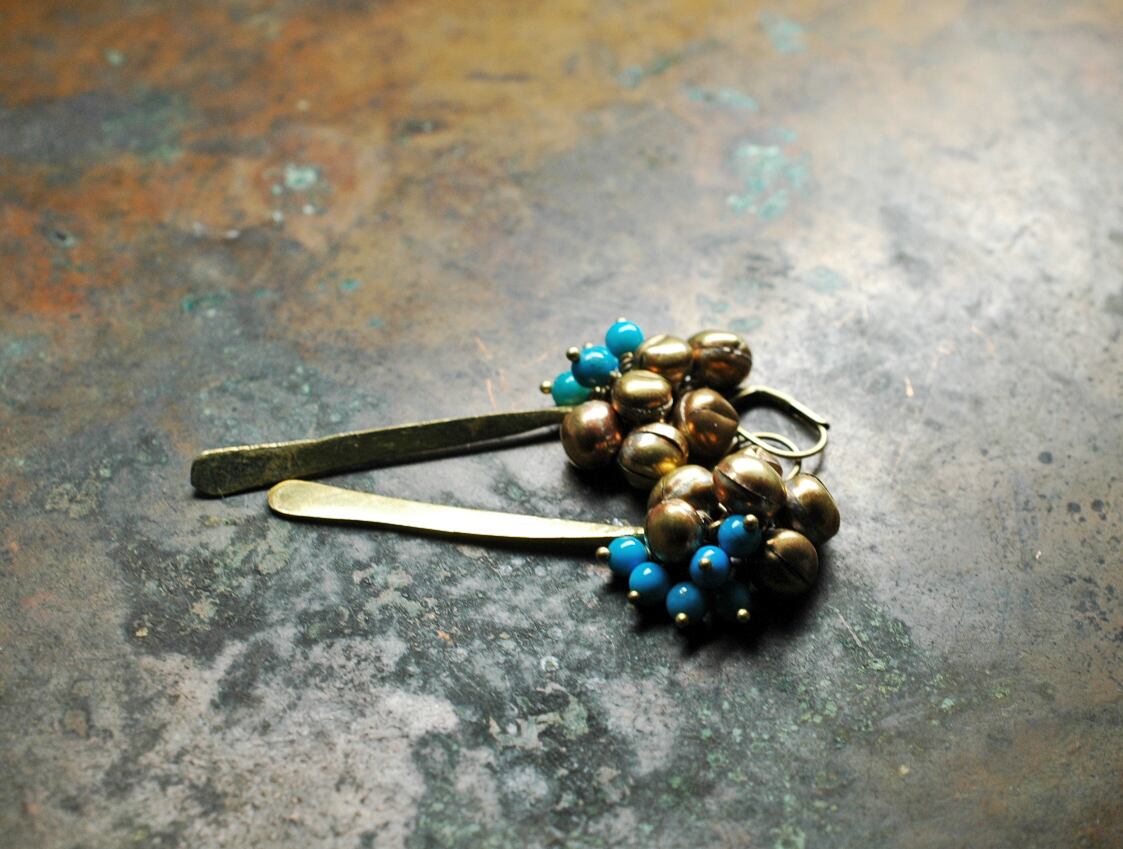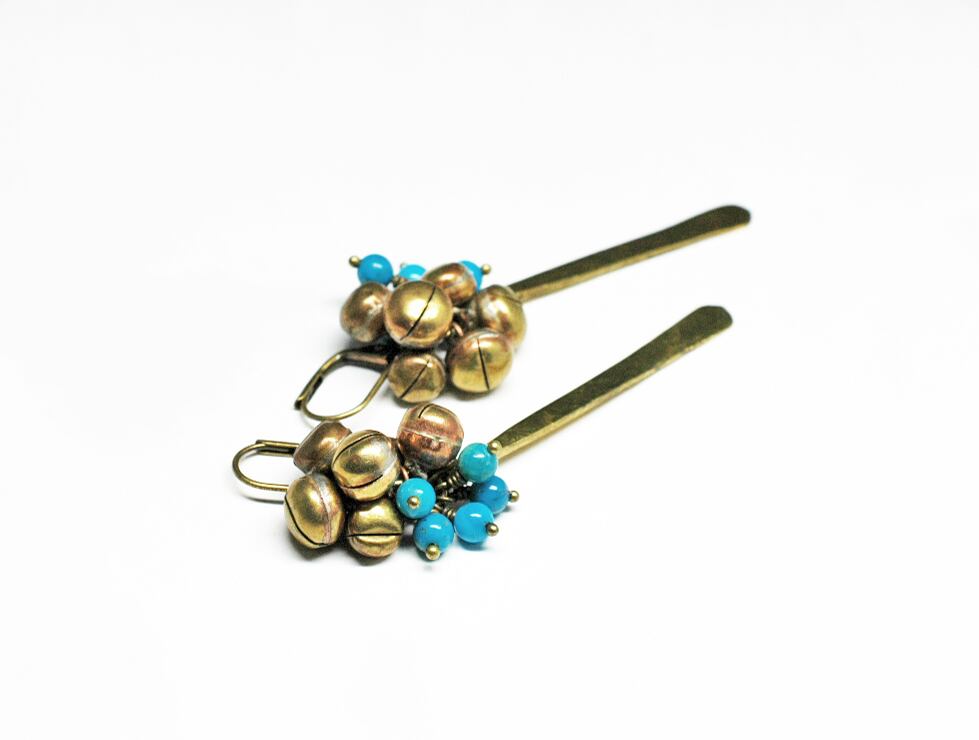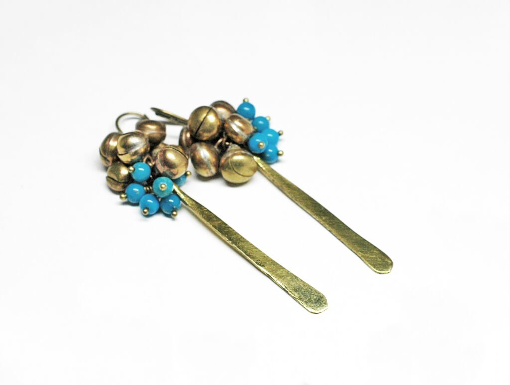 細長いアフリカンブラスと、たわわに実った鈴とターコイズを繋げたピアスです。