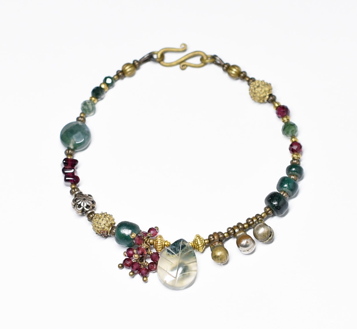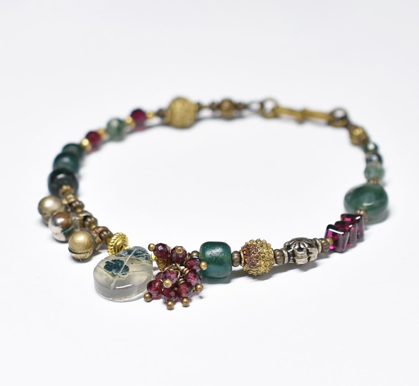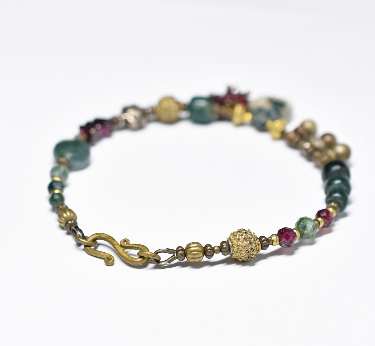 モスアゲートとガーネット、ブラスビーズ、インドシルバー、グリーンブルービーズ、民族鈴のブレス